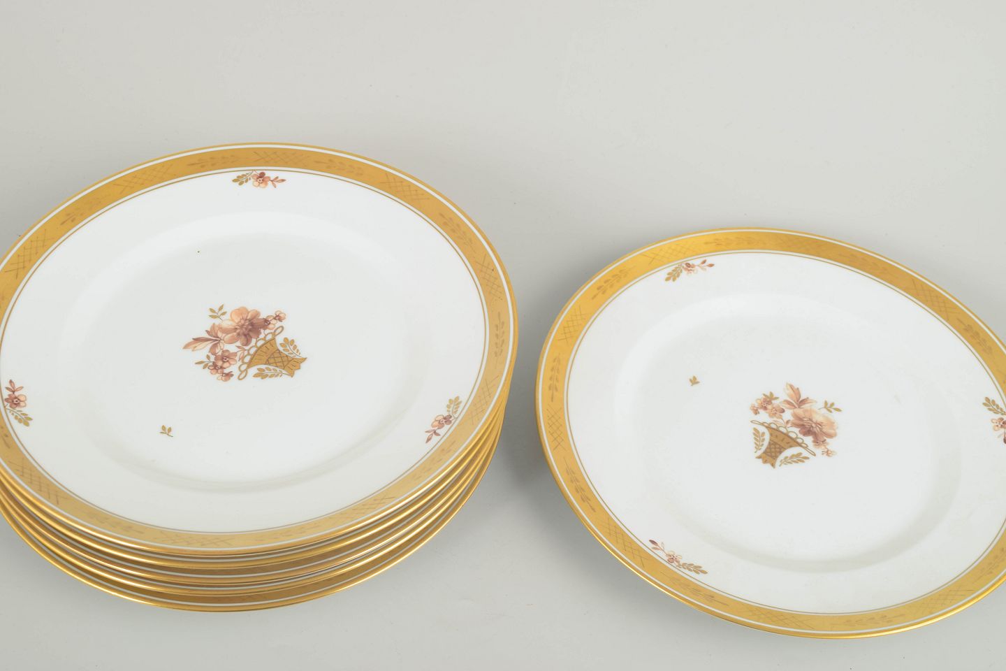 Sæt med seks elegante middagstallerkener i porcelæn fra Royal Copenhagens “Guldkurv”-serie, model 595/9586. Klassisk hvid porcelæn med bred forgyldt kant og håndmalet blomsterkurvmotiv.
