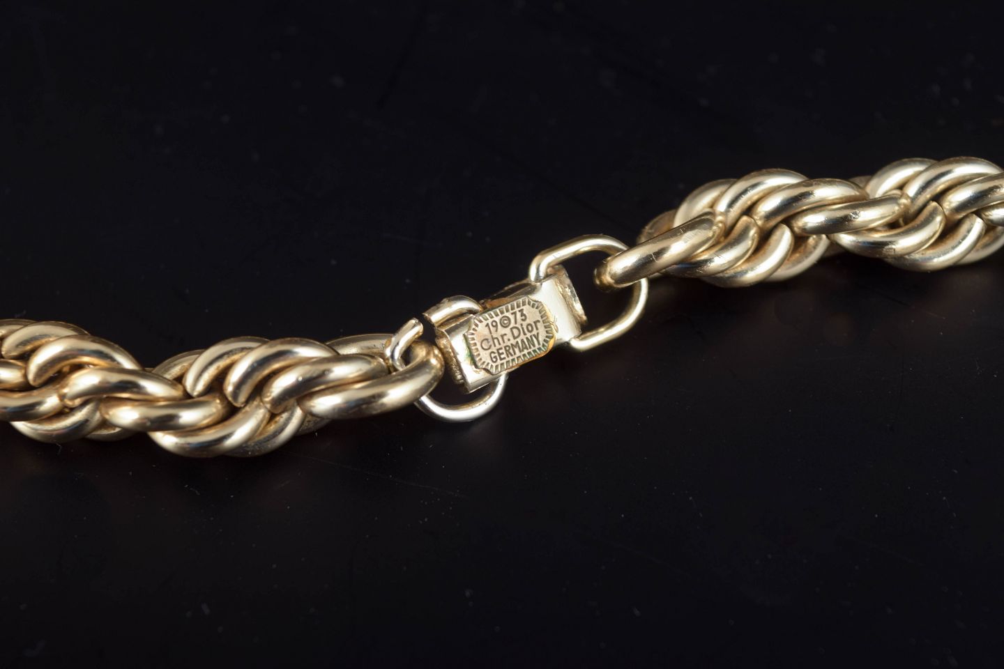 Elegant og kraftig snoet kæde i forgyldt metal, udført i Dior’s karakteristiske 1970’er-stil. Et markant, luksuriøst smykke med flot glød og tidstypisk udtryk. Længde ca. 85 cm.