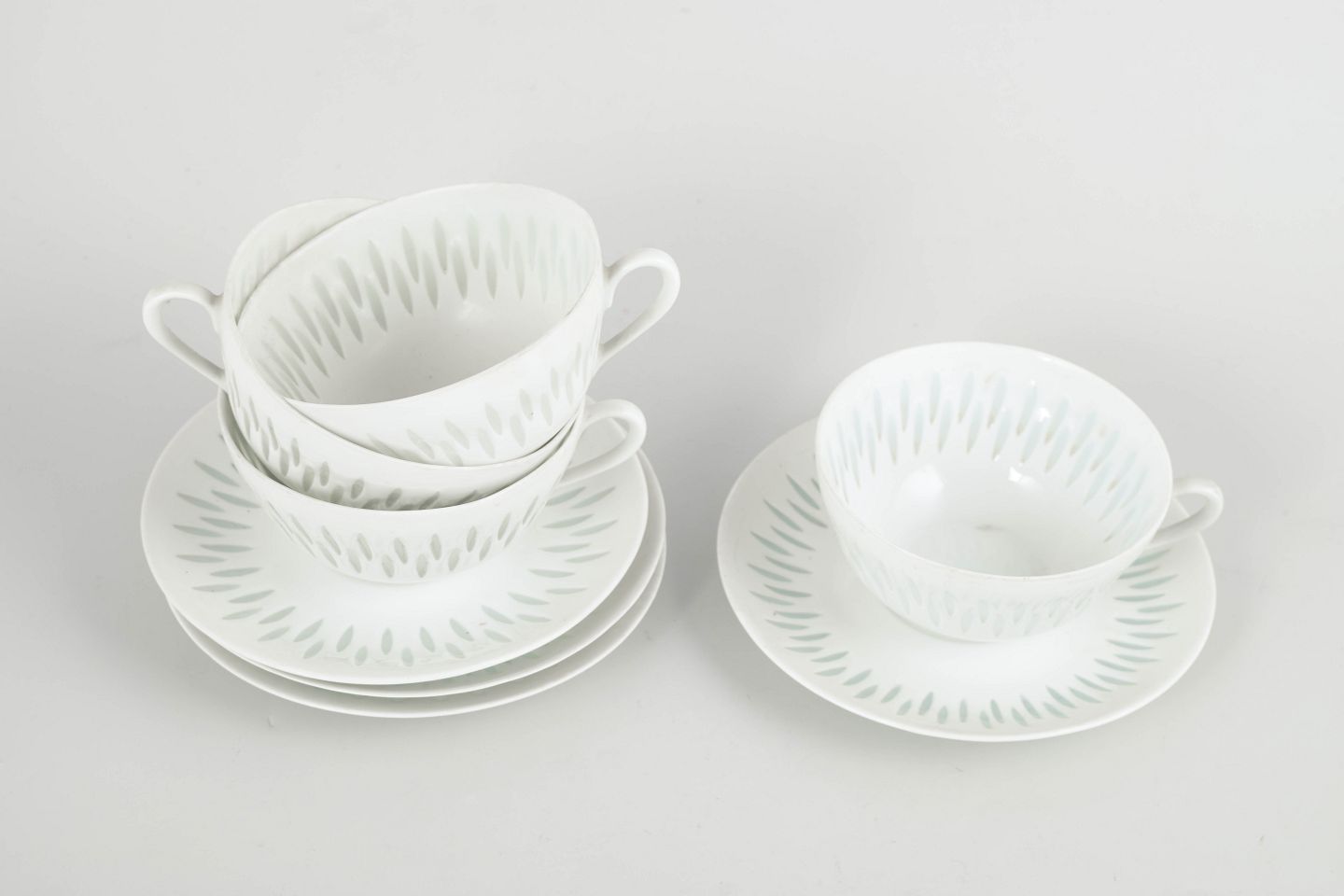 Sæt bestående af fire tekopper med tilhørende underkopper i hvidt porcelæn med gennembrudt “rice porcelain”-dekoration. De aflange perforeringer udfyldt med transparent glasur giver porcelænet et let og næsten translucent udtryk, mens de enkle, afrundede former er karakteristiske for Friedl Holzer-Kjellbergs sene modernistiske porcelænsdesign for Arabia.