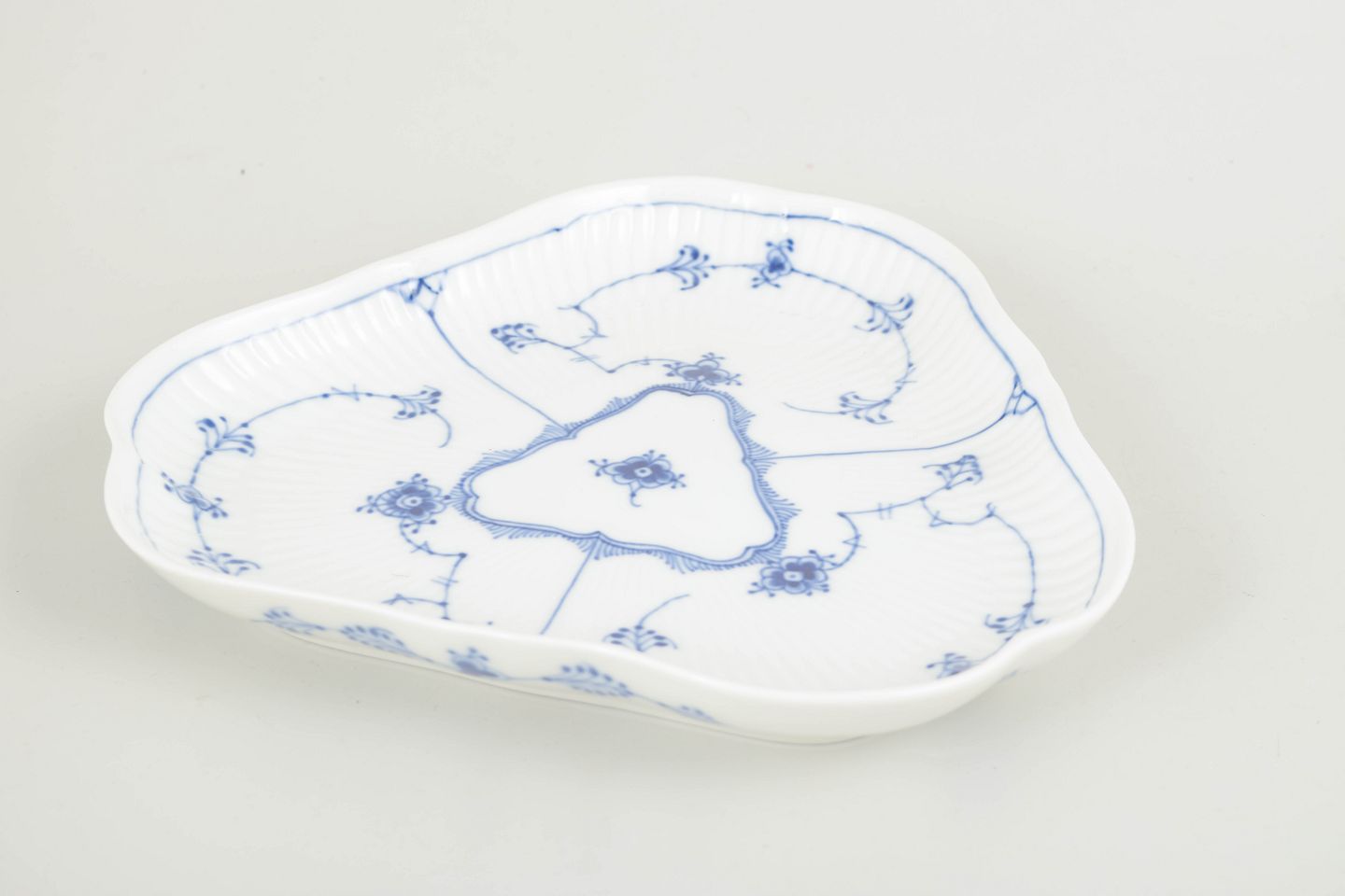 Royal Copenhagen Musselmalet Riflet trekantet fad, 1965.