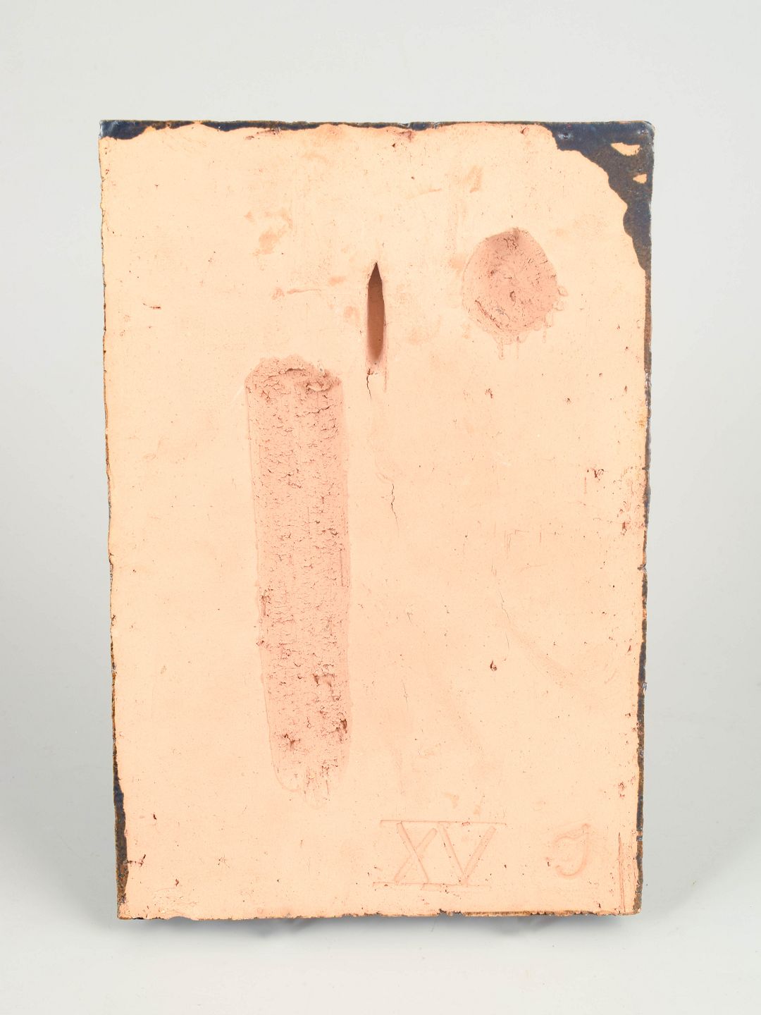 Abstrakt vægrelief udført i stentøj med markant, arkitektonisk opbygning og kraftig reliefvirkning. Kompositionen er præget af geometriske former og strukturerede felter, kombineret med dyb glasur i blå, kobberbrune og rustrøde nuancer, typisk for europæisk studiokeramik i 1970’erne.
