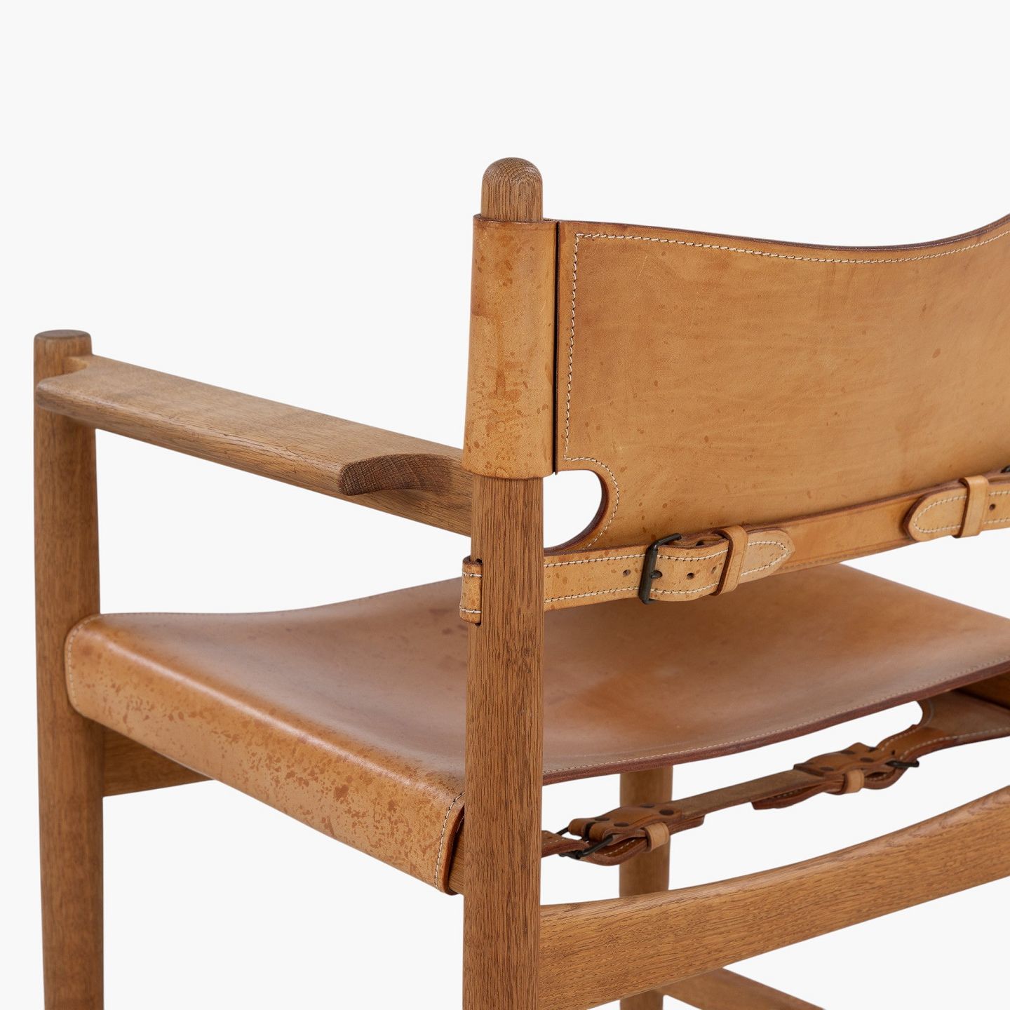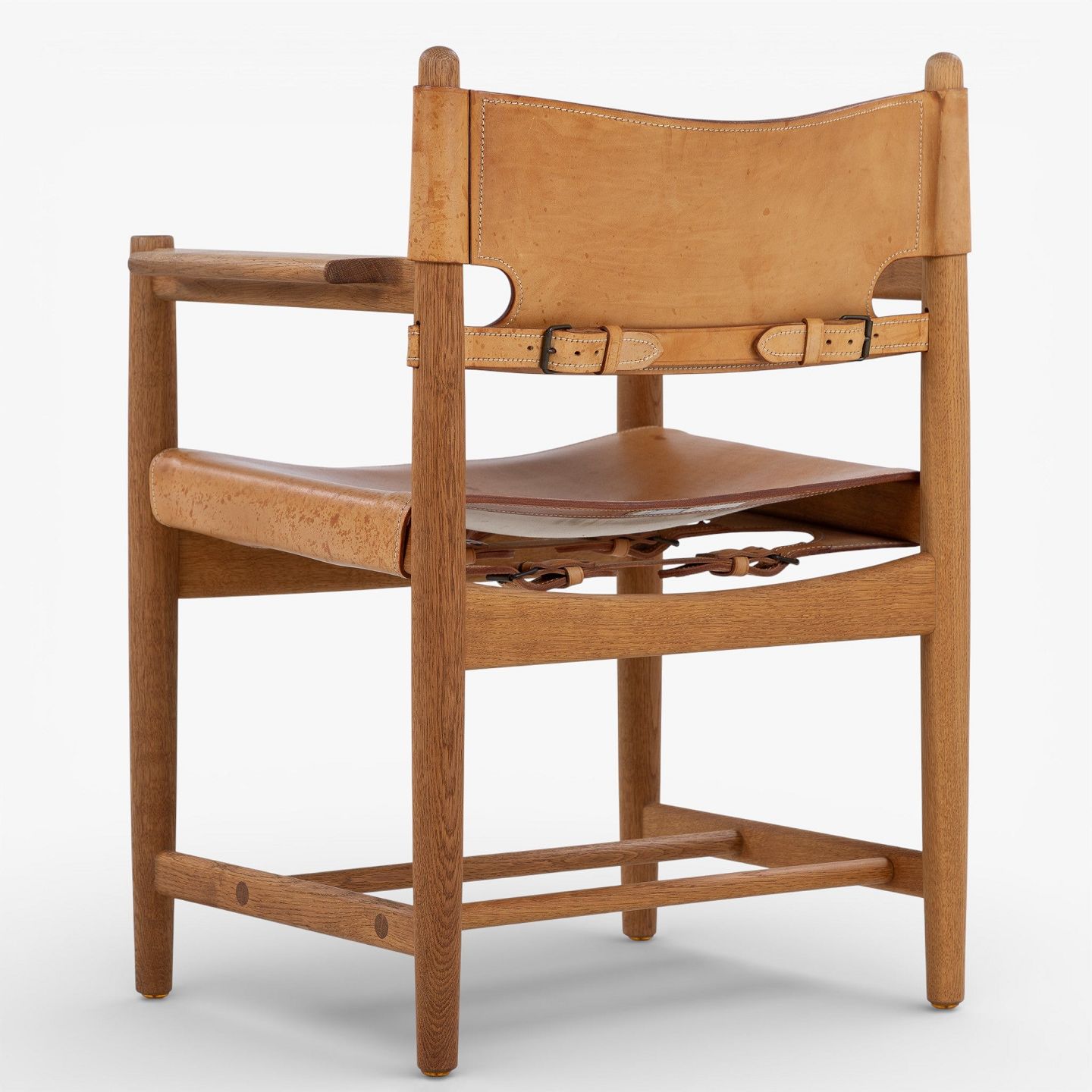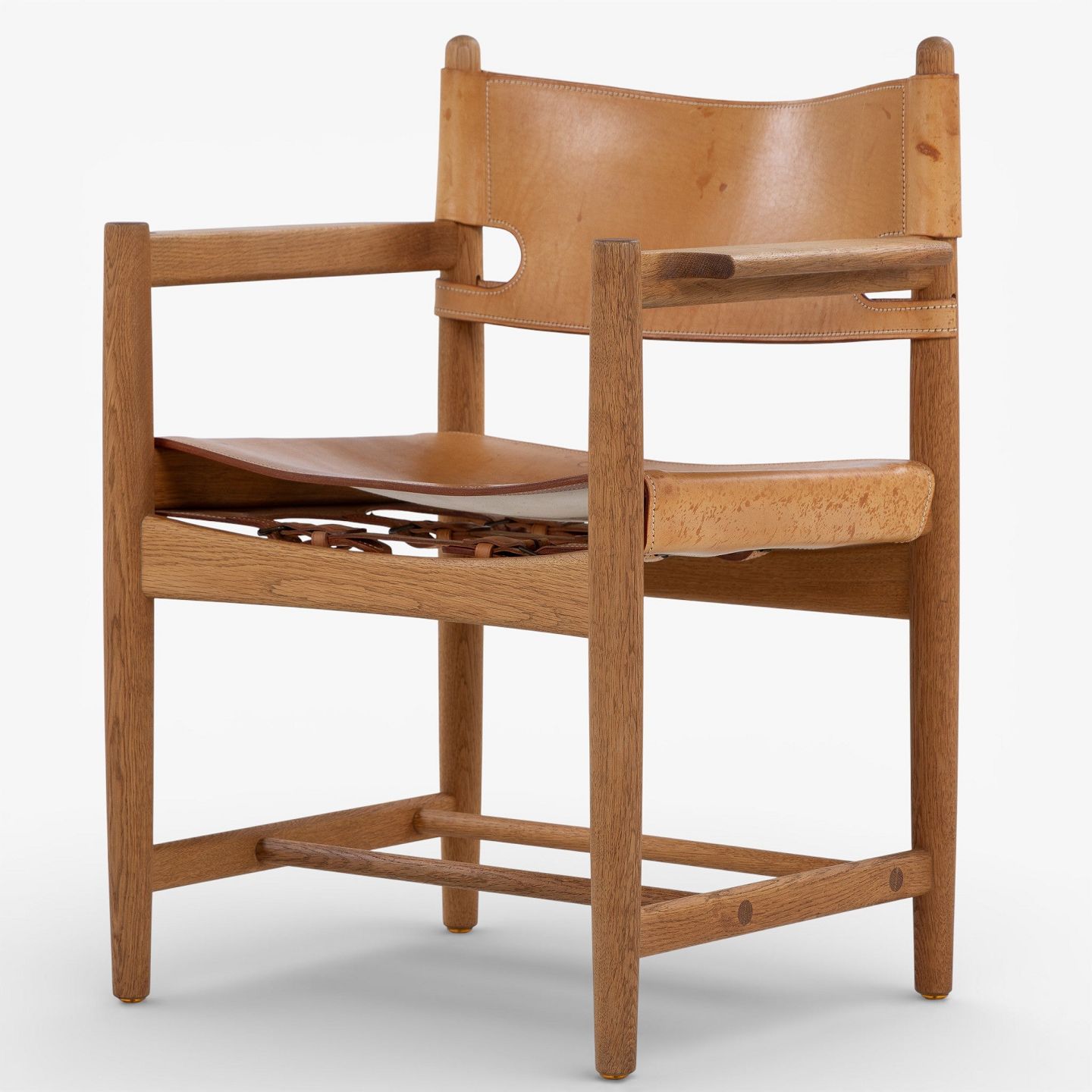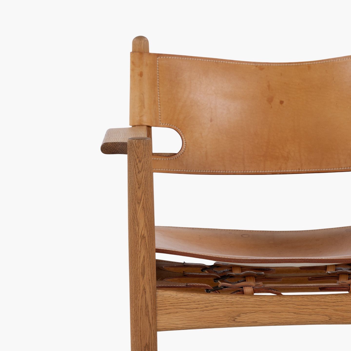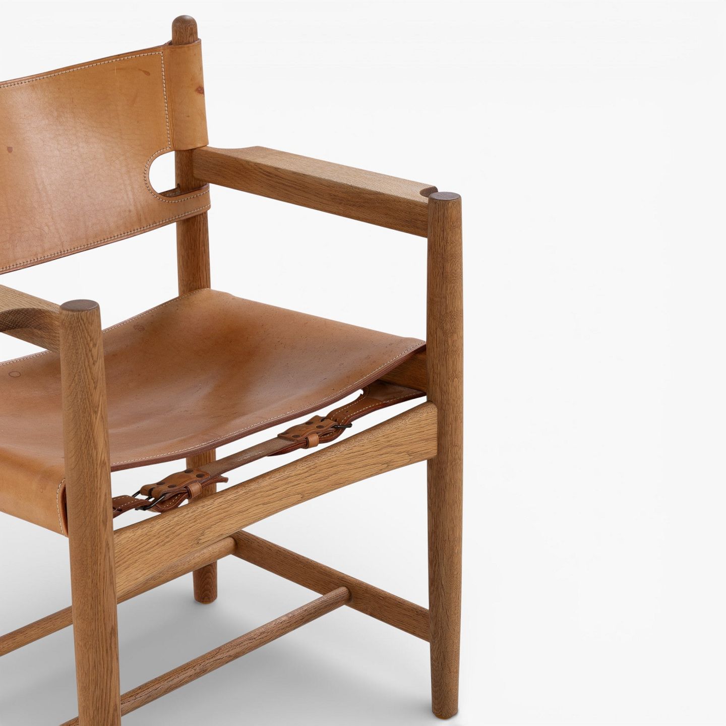 BM 3238 - 'Jagtstol' i patineret egetræ og kernelæder m. armlæn. Mærket fra producent.