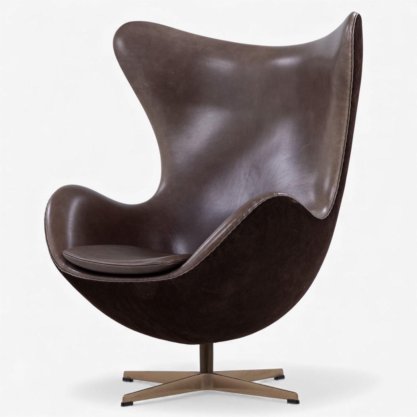 AJ 3316 - 'Ægget'-lænestol m. skammel i originalt, mørkebrunt Elegance-læder og brunt ruskind på stel i bronze. Jubilæumsmodel fra 2008. Nummeret 489/999.