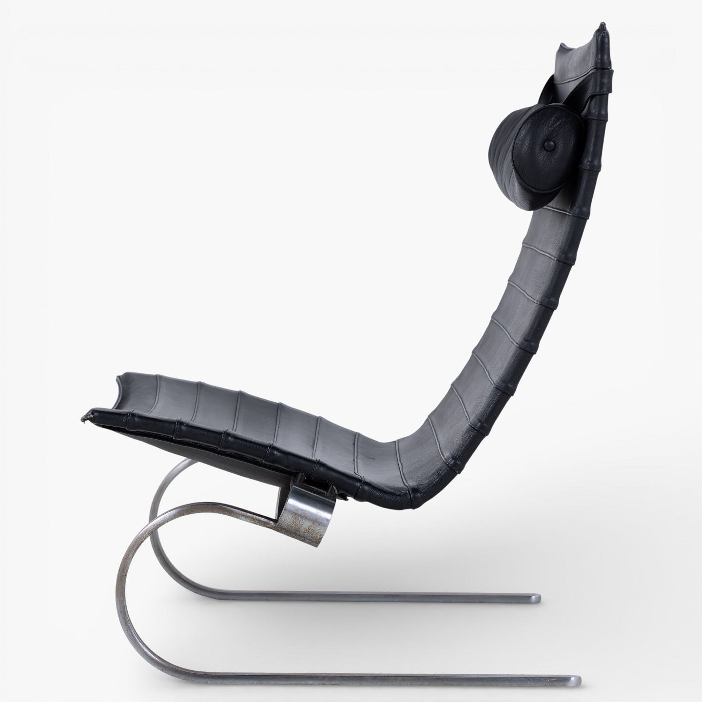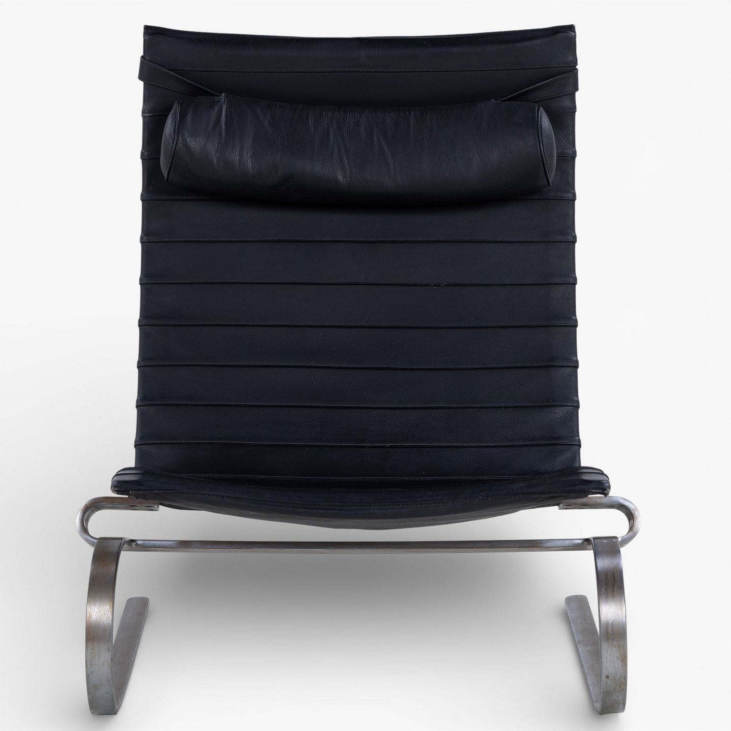 PK 20 - Lænestol i originalt sort læder med nakkehynde og stel af fjederstål. Formgivet i 1968.