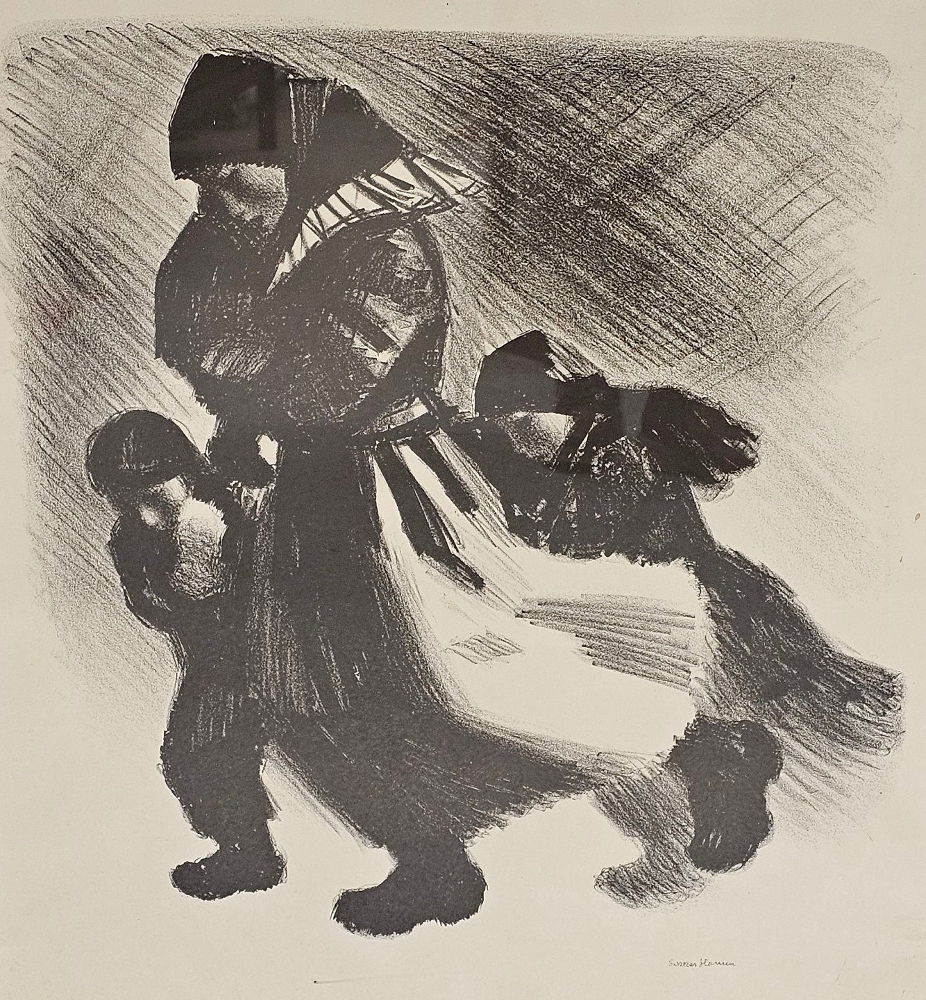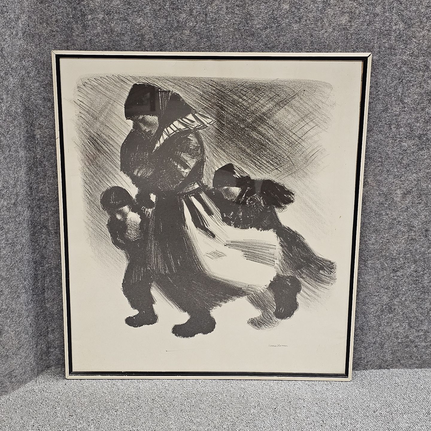Tryk på papir med motiv af en kvinde med tre børn monteret i sort og hvid ramme