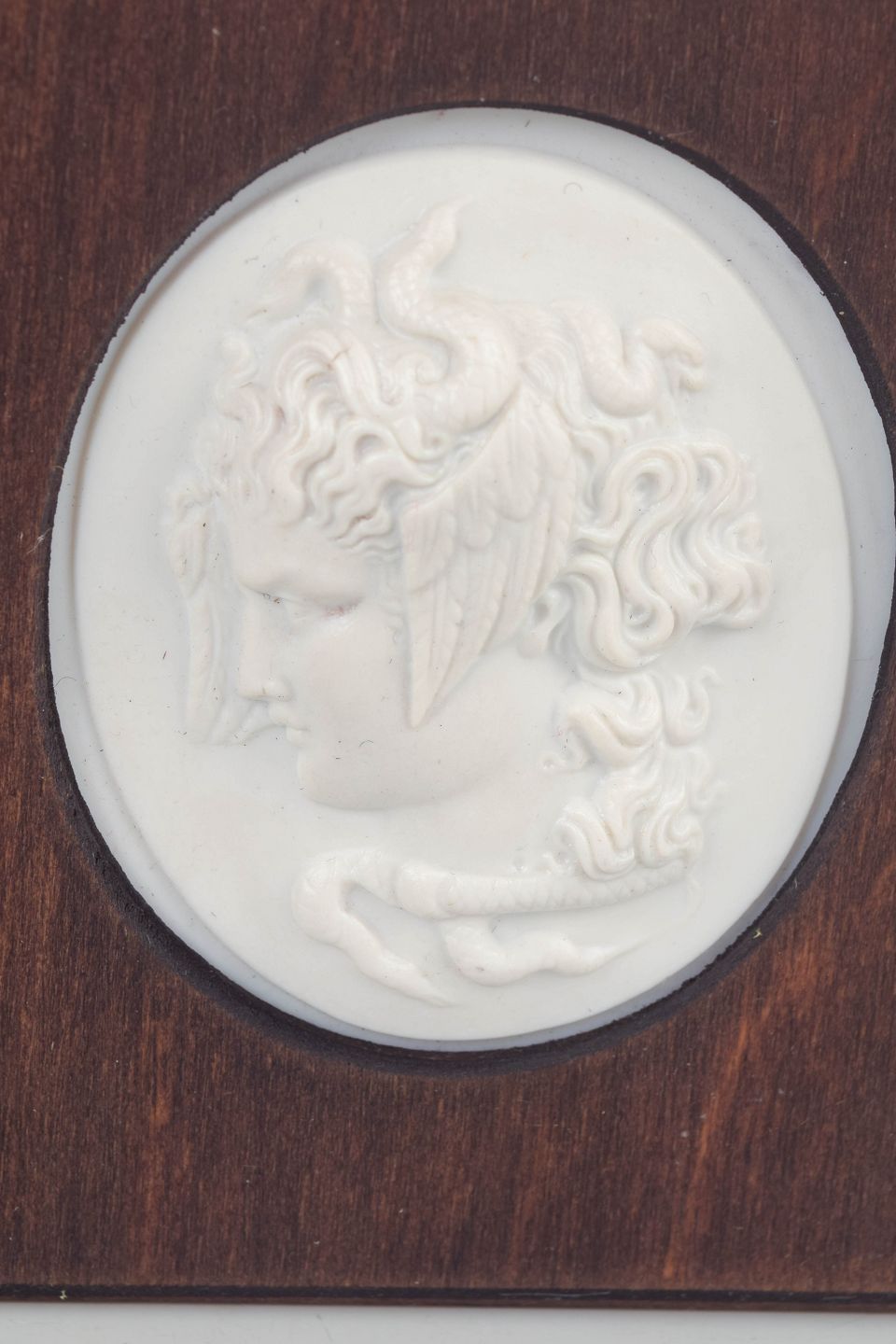 Lille reliefplakette i hvid biscuit porcelæn med klassisk profilportræt, monteret i kvadratisk træramme med ovalt udsnit. Den matte biscuit overflade giver motivet et fint, skulpturelt præg og fremhæver den bløde modellering af ansigt og hår.