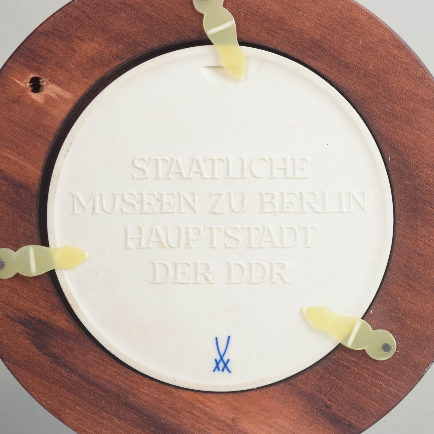 Rund reliefplakette i hvid biscuit porcelæn med klassisk profilportræt og cirkulær indskrift, monteret i bred, rund træramme. Udført som en neoklassisk, medalje lignende komposition, hvor den matte biscuit overflade fremhæver de fine detaljer i portrættet.
