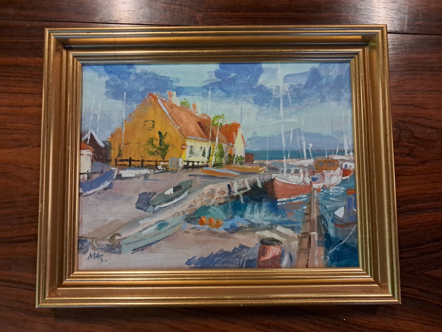 Maleri af Dragør Havn i guldmalet ramme, af : Mogens Amdi Thorsen (1924-2016)