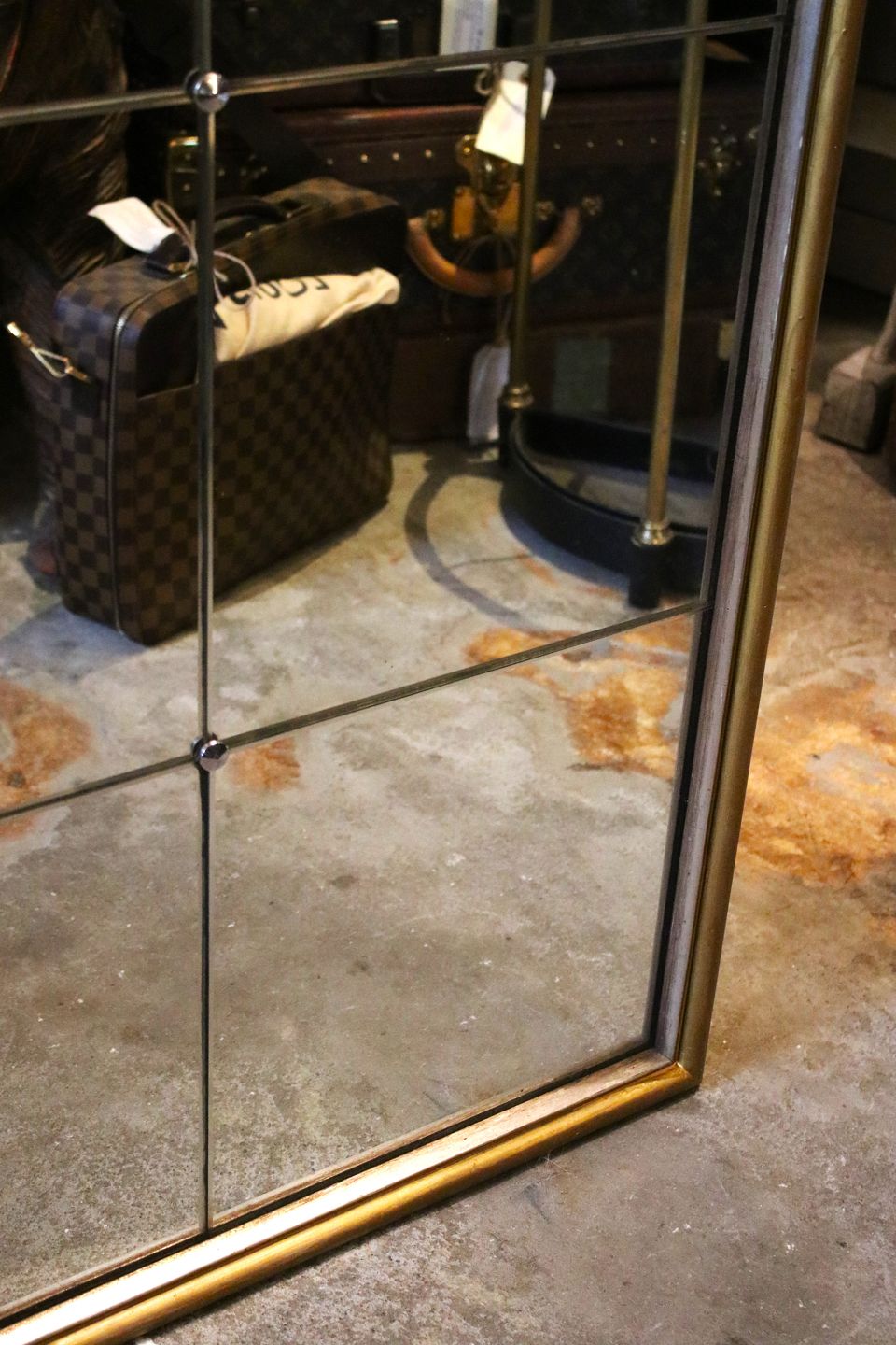 Gammelt fransk "Bistro" spejl med 20 stk. spejlglas med fin patina i spejlglasset og indrammet i bred forgyldt træ ramme med smal sølvkant. Måler H: 160cm. B: 129cm.