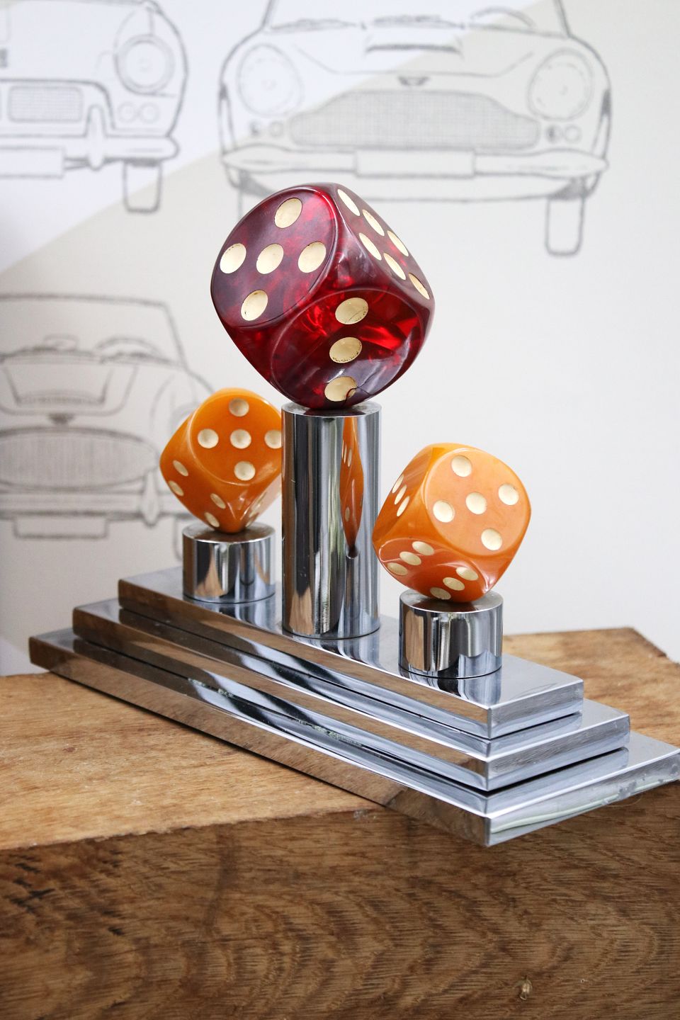 Dekorativ , gammel spille pokal i krom med 3 store terninger i farvet akryl...