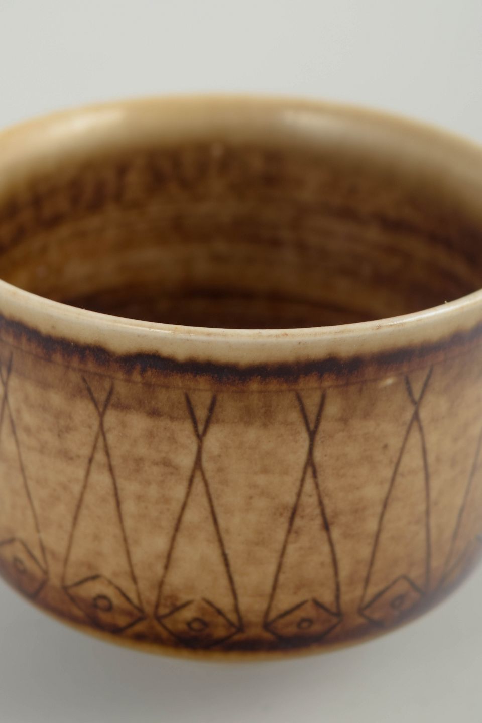 Drejet skål i stentøj med let fodring og afrundet krop. Udført med varm, brunlig glasur og indridset geometrisk dekoration i gentagne lodrette felter omkring ydersiden. Indvendigt ses en mere tæt, levende glasur. Signeret i bunden og fremstillet hos Höganäs i 1970’erne.