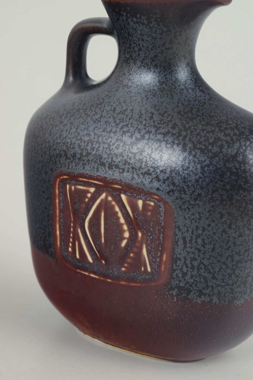 Kompakt og velafbalanceret kande i stentøj med afrundet, skulpturel form. Udført med karakteristisk mørk, fint spættet glasur i grålige og brunrøde nuancer, med integreret hank og let udadbøjet hældetud. Et klassisk eksempel på Gunnar Nylunds sikre proportionering og materialefølelse hos Rörstrand i midten af det 20. århundrede.
