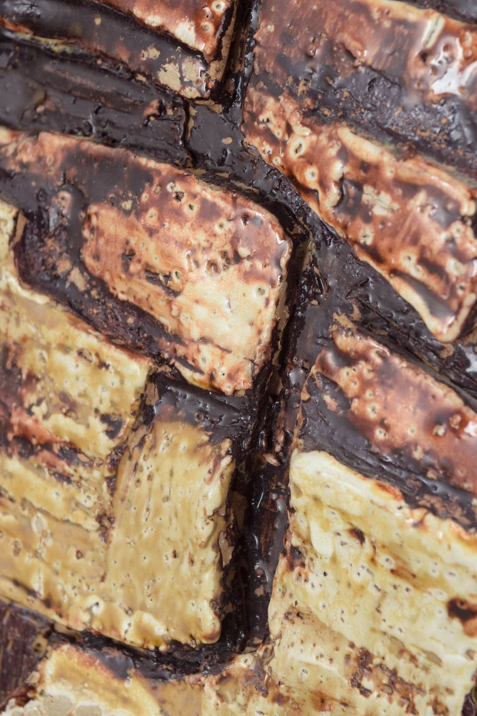 Abstrakt, brutalistisk vægrelief i stentøj med kraftig, struktureret overflade og reliefornamentik. Naturlige jordfarver i creme, okker og brune nuancer. Unikt, håndlavet værk, signeret.