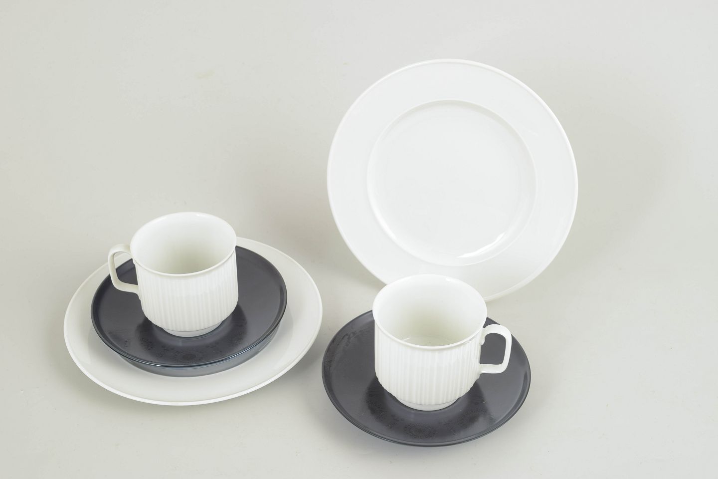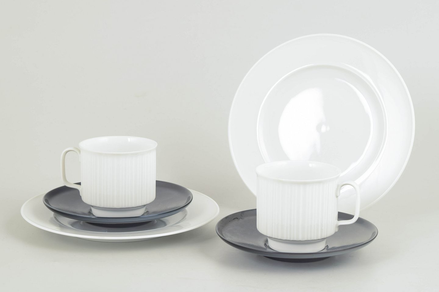 Sæt bestående af to kaffekopper i hvidt porcelæn med karakteristisk rillet overflade, hver med tilhørende underkop i kontrasterende glasur, samt to matchende kagetallerkener. Et funktionelt og stramt formsprog med tydelig nordisk modernistisk karakter.