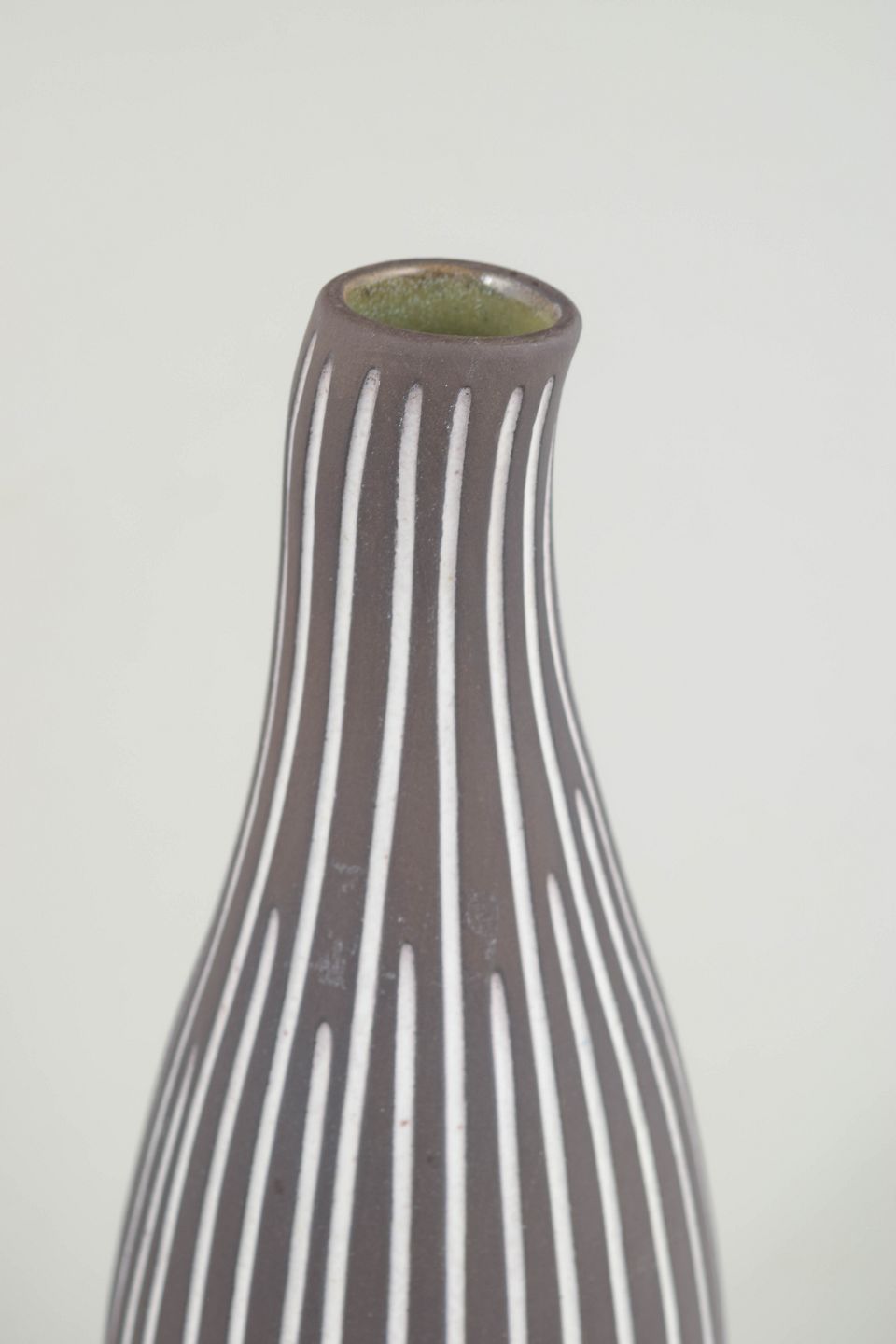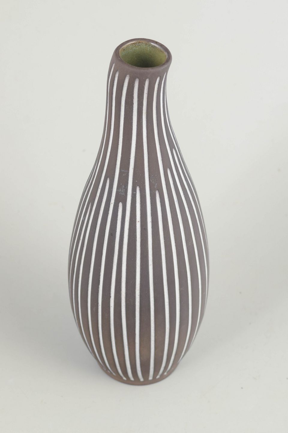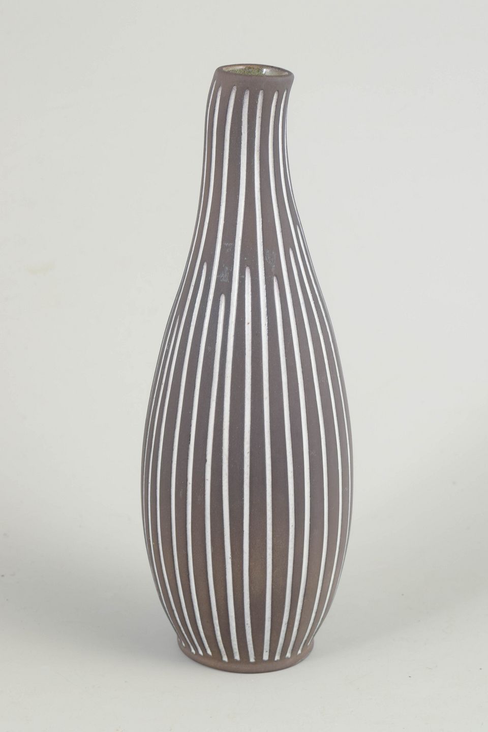 Slank, aflange vase i stentøj med karakteristisk håndmalet hvid stribedekor på mørk brun bund. Elegant, nordisk modernistisk formsprog.