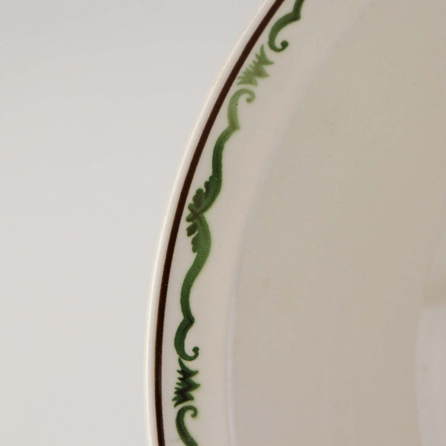 Fajancestel i stelform G med dekoration af orangegule blomster og grønne guirlander på lys baggrund med brun kant.