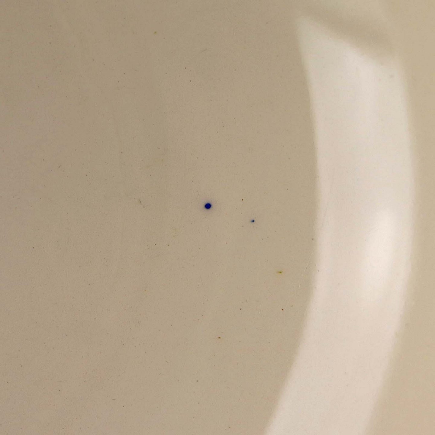 Fremstår med to mindre blå pletter underglasuren samt ujævnhed i glasuren på skålens yderside.
