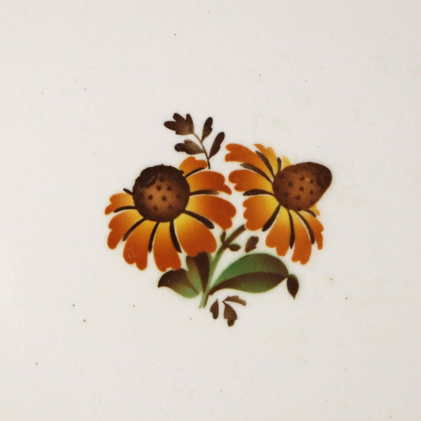 Fajancestel i stelform G med dekoration af orangegule blomster og grønne guirlander på lys baggrund med brun kant.