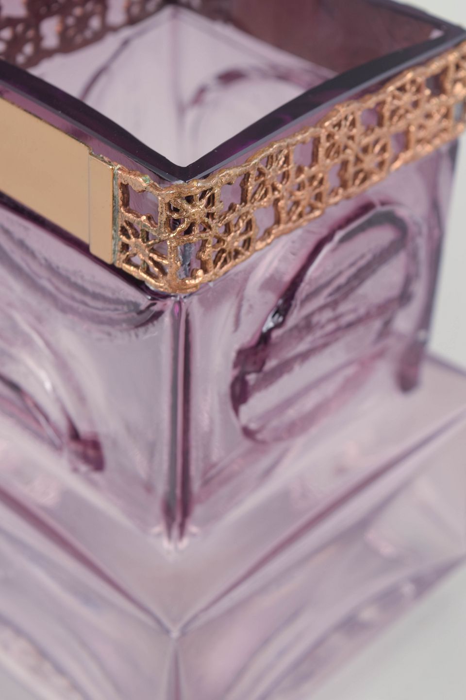 Skulpturel vase i lys violet mundblæst kunstglas med markant geometrisk form og dekorativ metalbort ved åbningen. Designet kombinerer massiv, facetteret glasopbygning med en fin, gennembrudt metalramme, hvilket skaber en tydelig kontrast mellem tyngde og lethed.