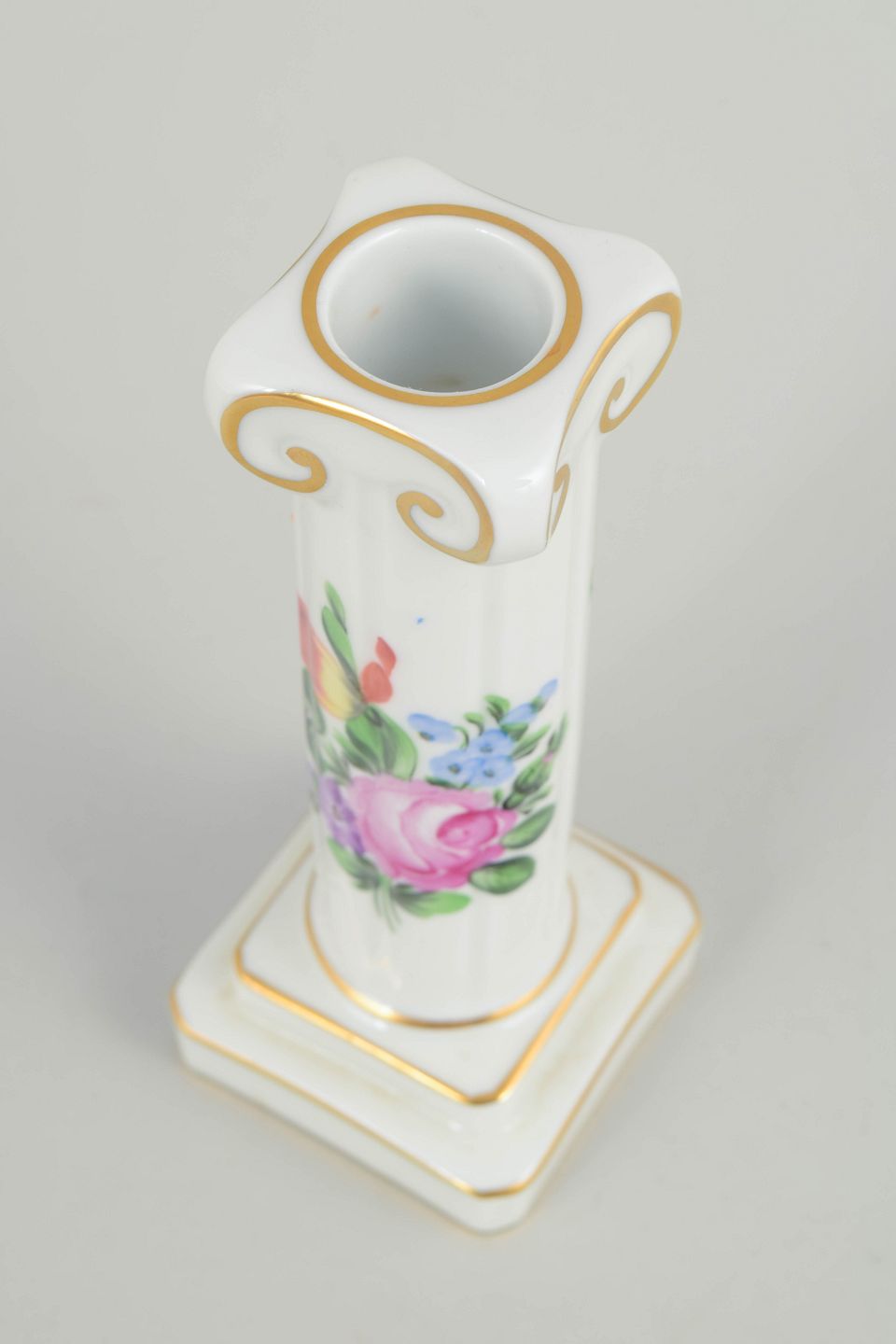 Håndmalet lysestage i glaseret porcelæn med blomsterdekoration i rosa, lilla, blå og grønne nuancer. Slank, balusterformet søjle på kvadratisk fod med profilerede detaljer og diskret forgyldning langs kanter og ornamentik.
