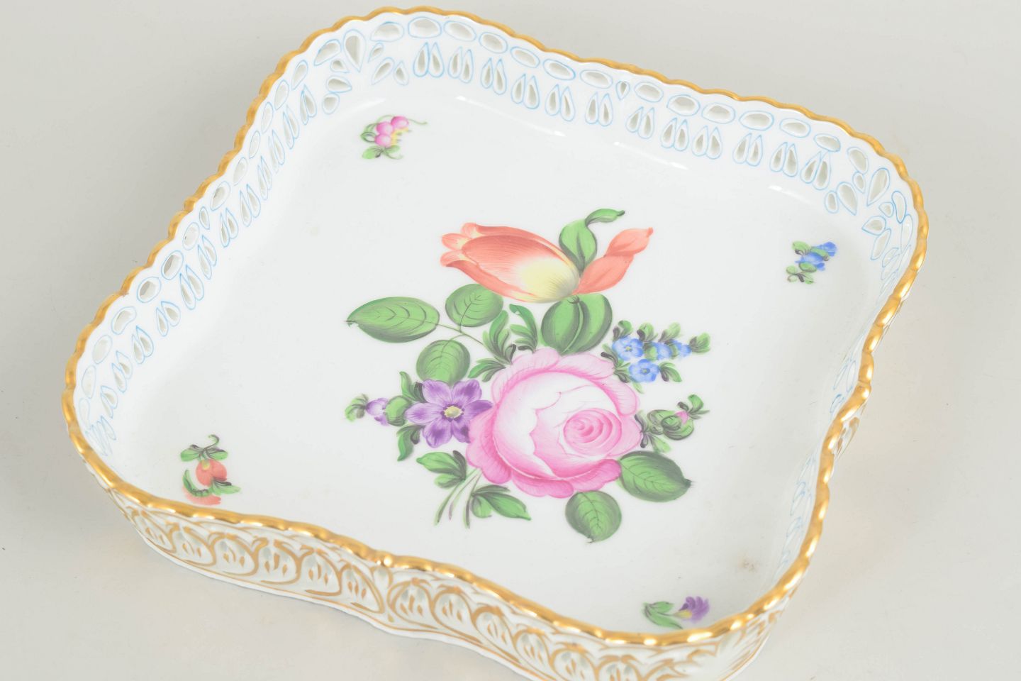 Håndmalet serveringsfad i glaseret porcelæn med blomstermotiv i rosa, grønne og blå nuancer. Kvadratisk form med bølget, profileret kant og rigt forgyldt dekoration langs randen.