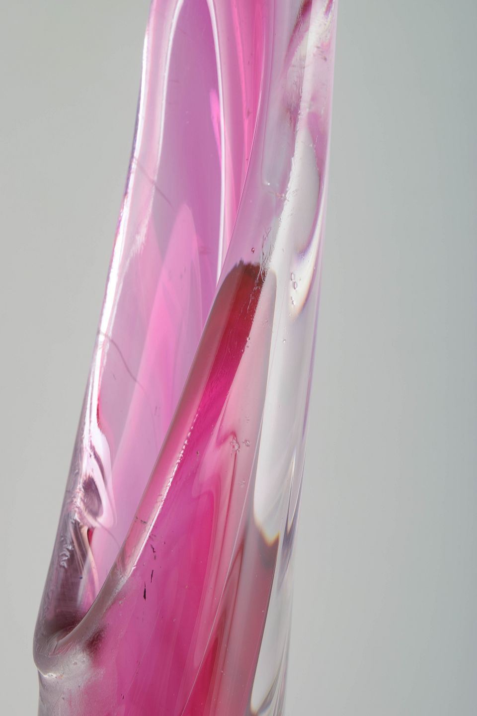 Murano-glas er kendt for sit høje håndværksniveau og sine raffinerede teknikker, hvor form, farve og optiske effekter ofte kombineres til skulpturelle udtryk. I 1960’erne og 70’erne blev slanke, monumentale vaser populære som markante interiørgenstande, skabt til at fremhæve glassets transparens og de drejede mønstre i materialet.