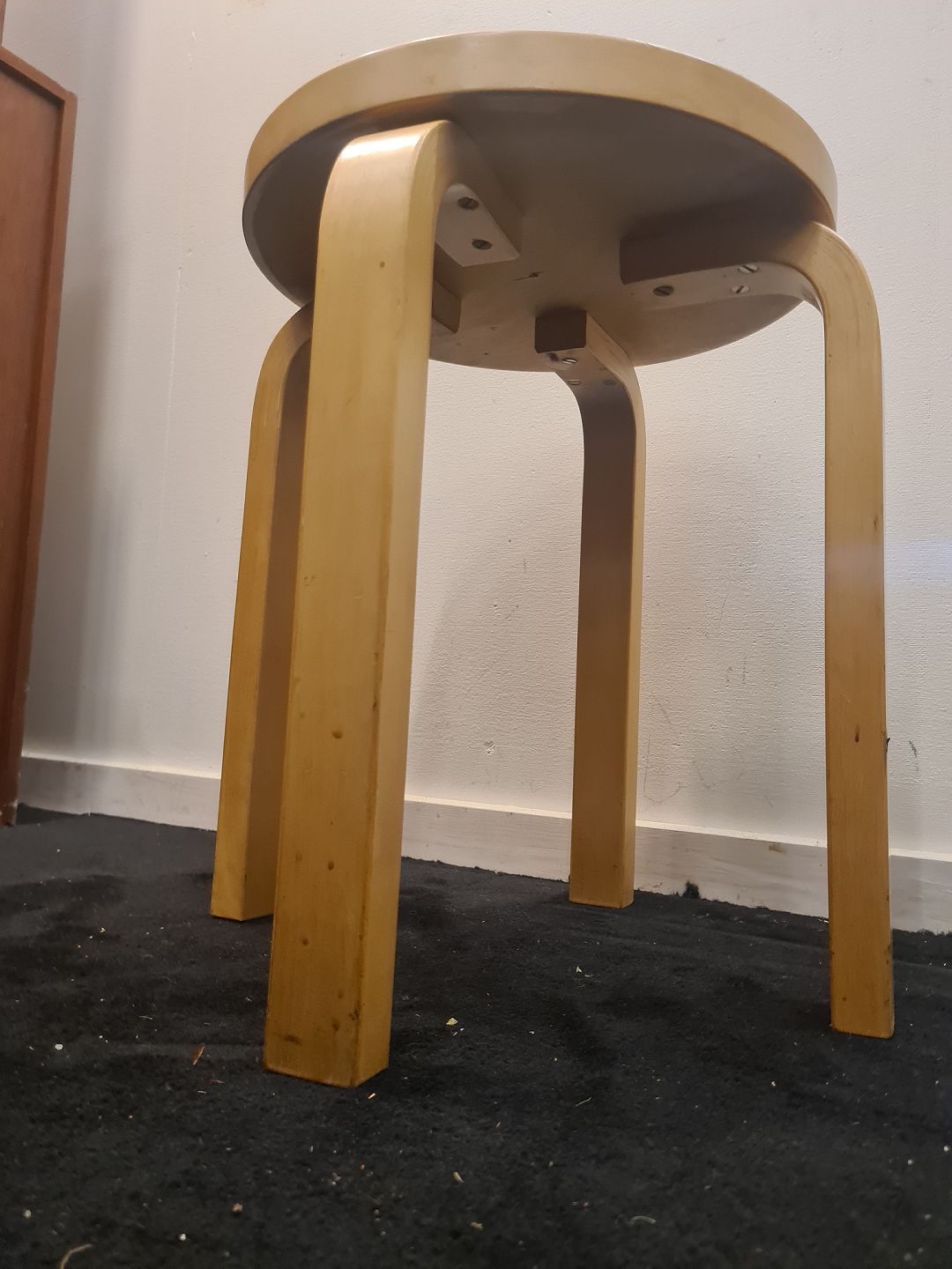 Taburet designet af Alvar Aalto. Her i bøg med sæde i sort formika. Fremstår pæn og velholdt uden de store brugsspor.