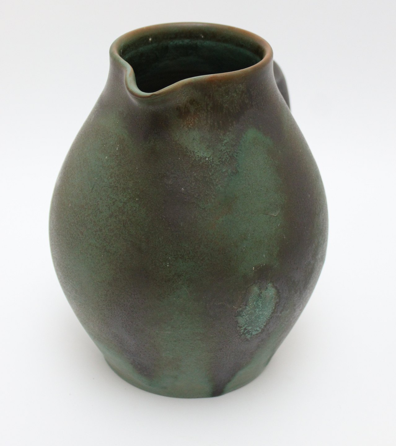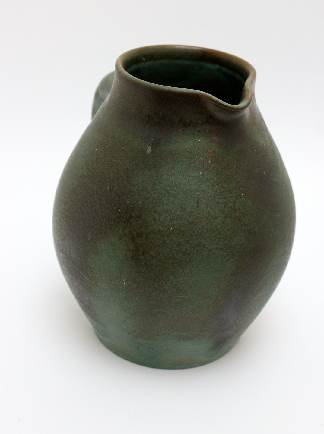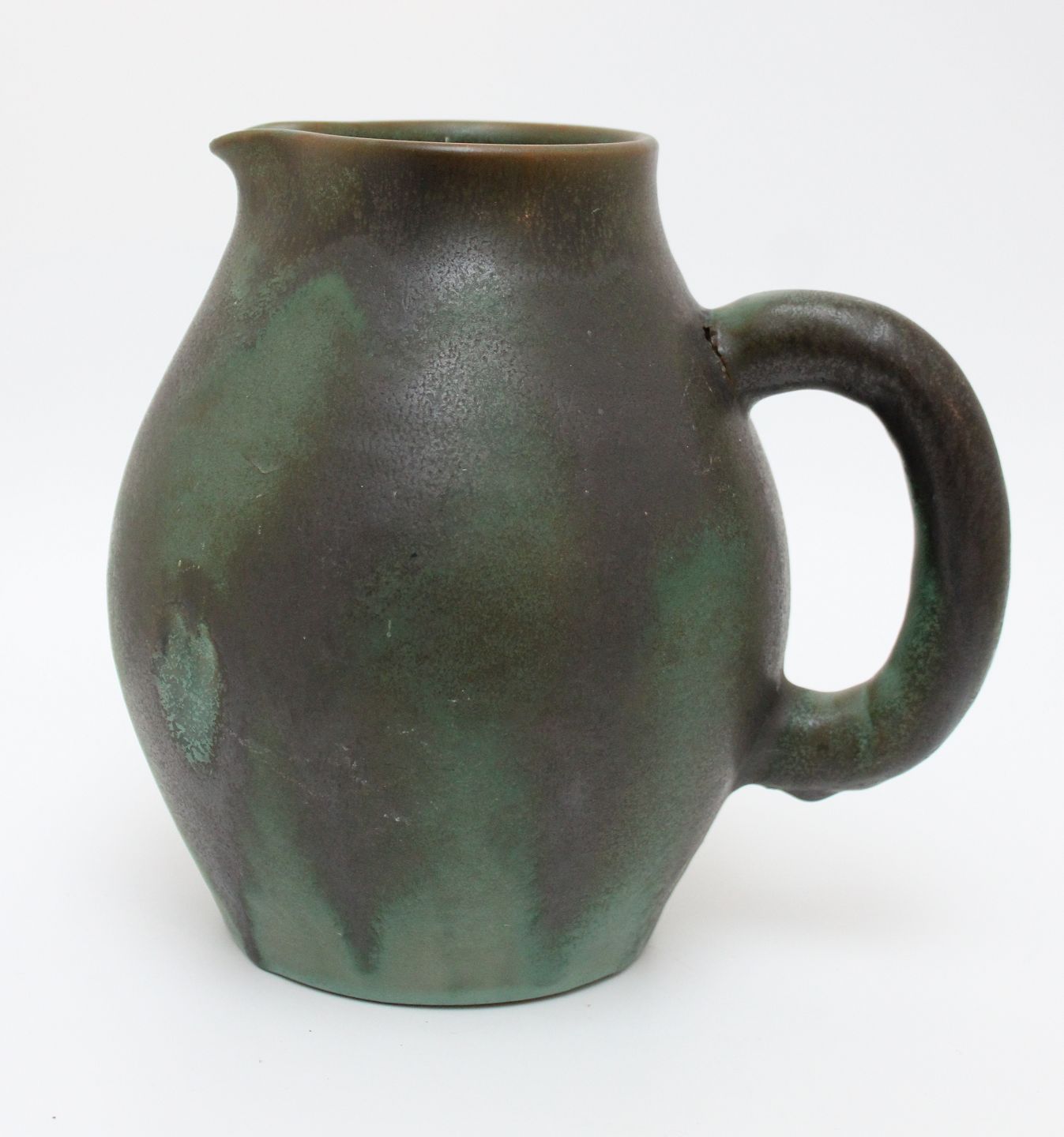 Elisabeth Birthe Sofie Klit født 1887. Stor flot og dekorativ kande i mat grøn brun glasur. Brændingsrevne ved hank. Højde 19 cm. Største diameter 14 cm. Signeret EBS. God stand. Pris: 475 kr.