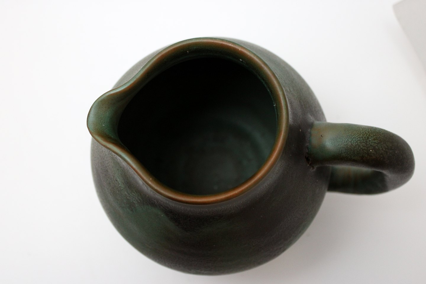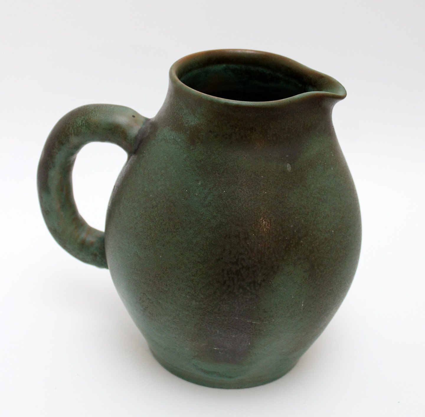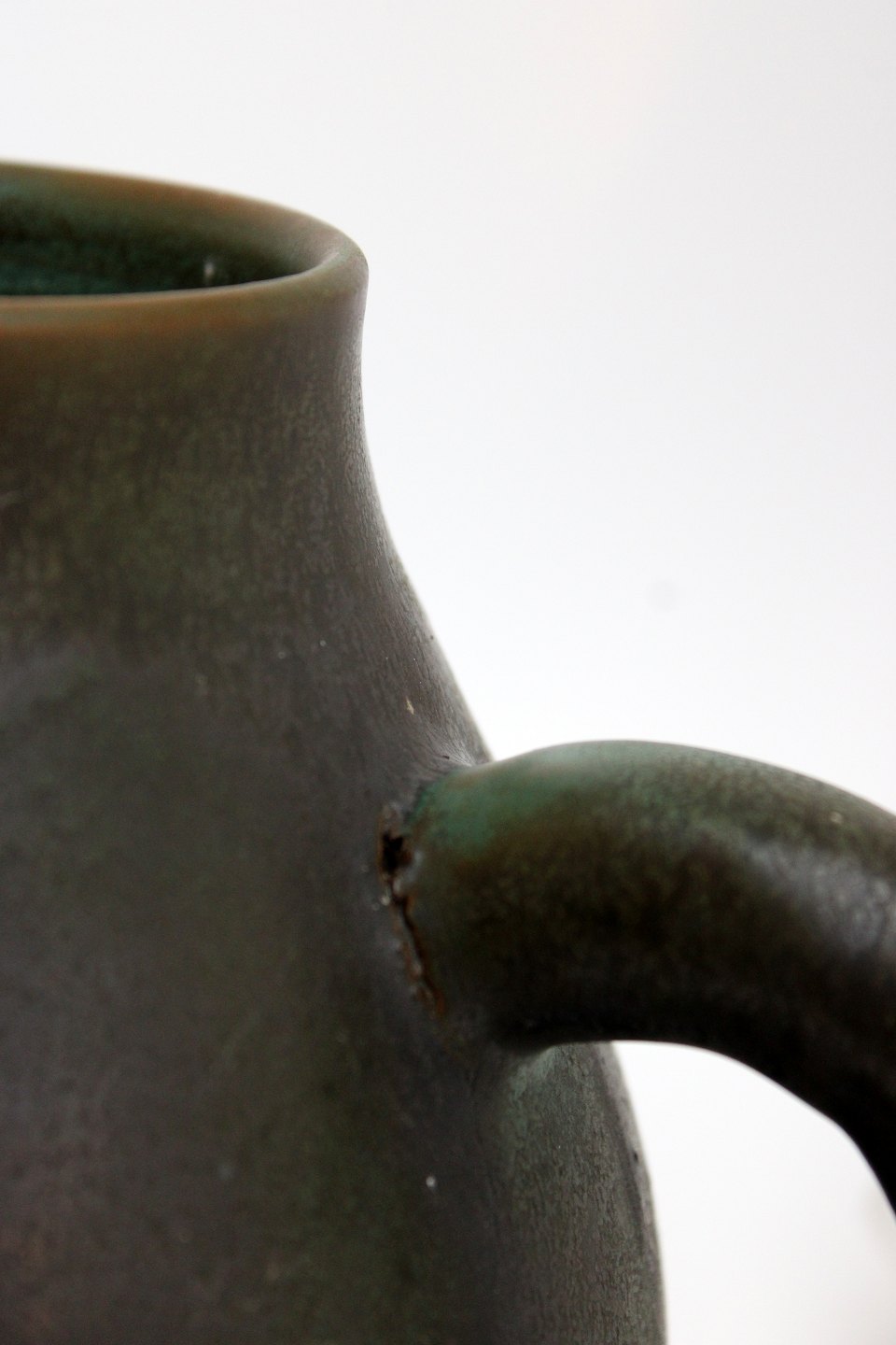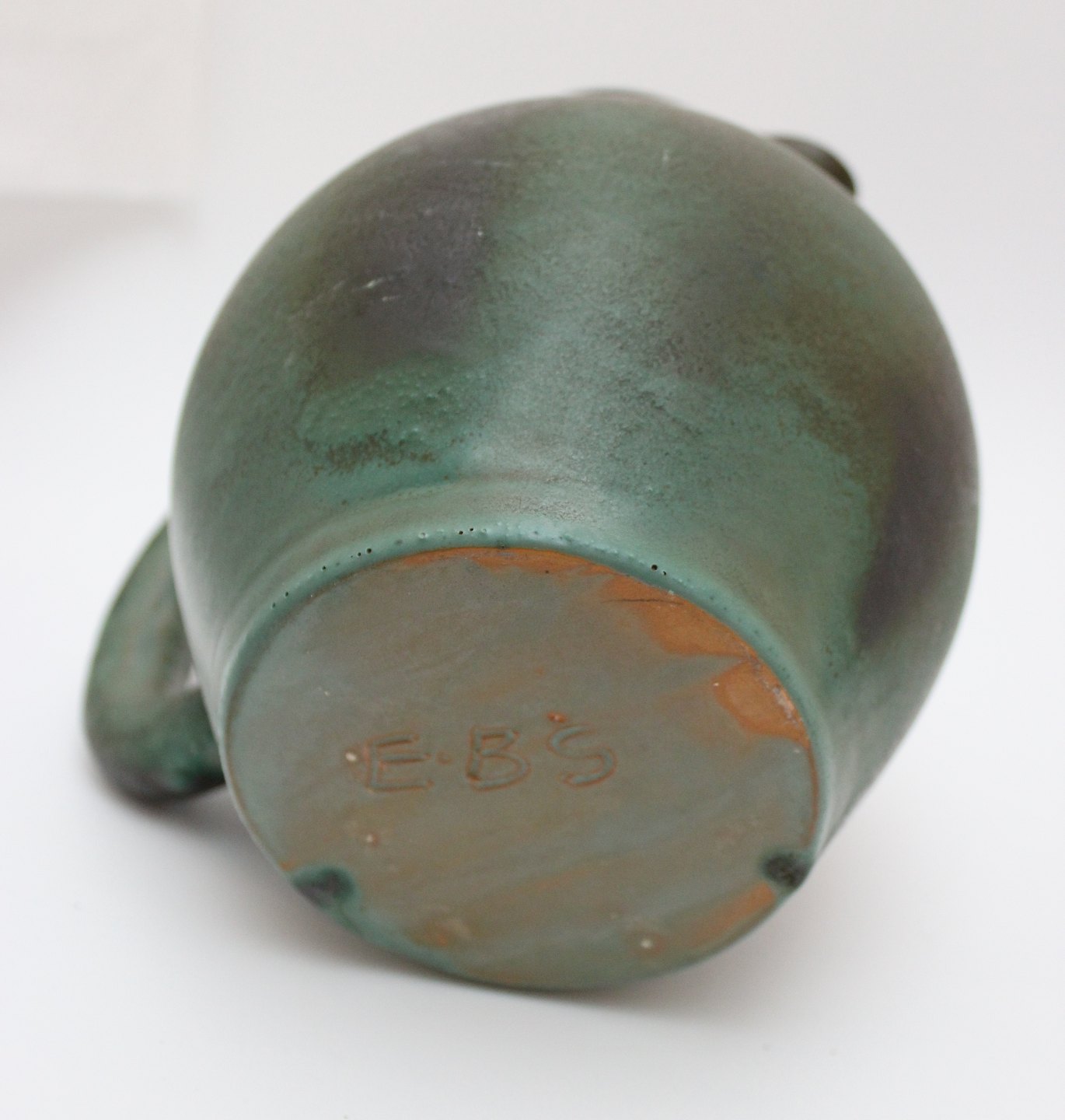 Elisabeth Birthe Sofie Klit født 1887. Stor flot og dekorativ kande i mat grøn brun glasur. Brændingsrevne ved hank. Højde 19 cm. Største diameter 14 cm. Signeret EBS. God stand. Pris: 475 kr.