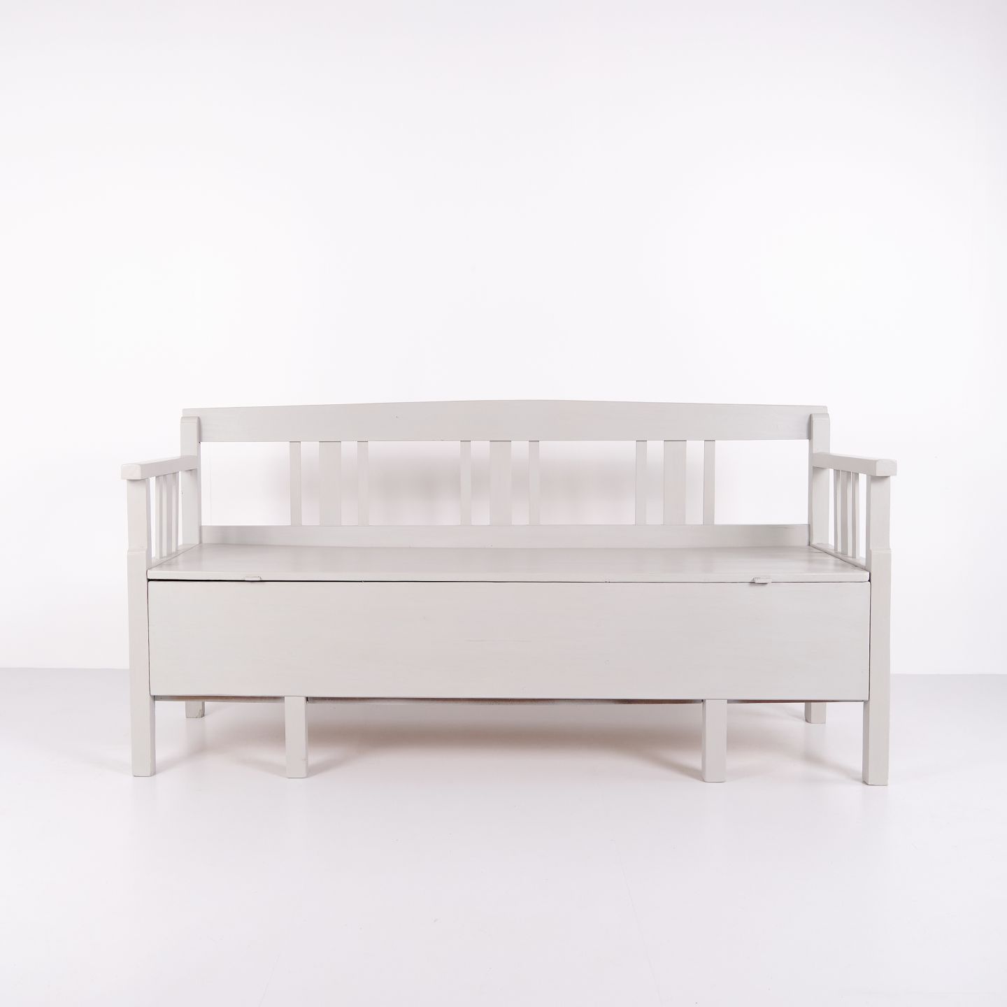 Antik slagbænk 1860’erne i gråmalet fyrretræ med opbevaring. Antik opbevaringsbænk 1800-tallet.
