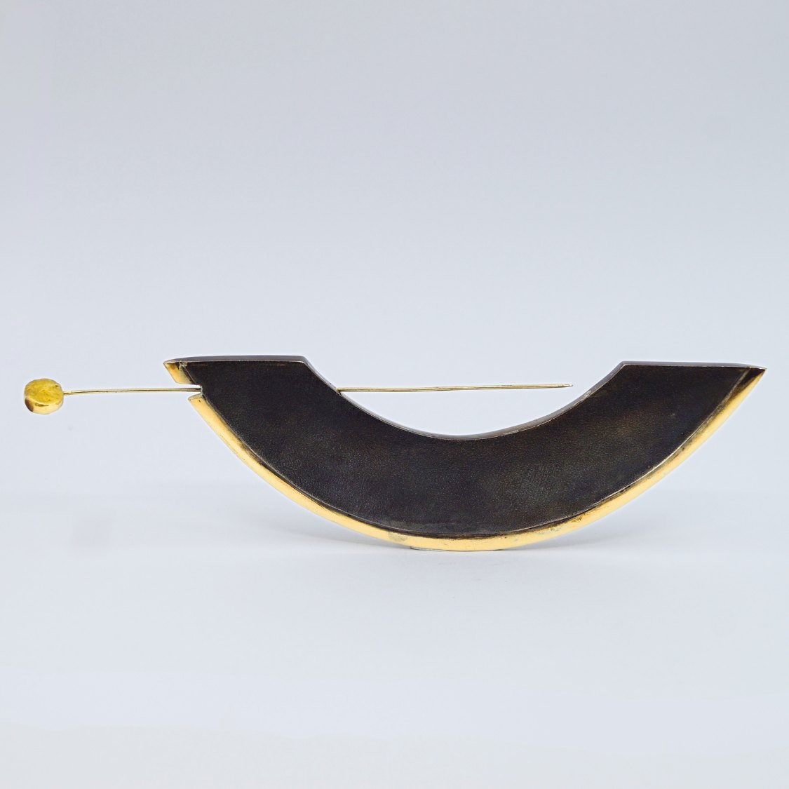 Anette Kræn; Large silver brooch with oxidized surface and 14k gold. Can be turned in two different ways, each with its own expression.