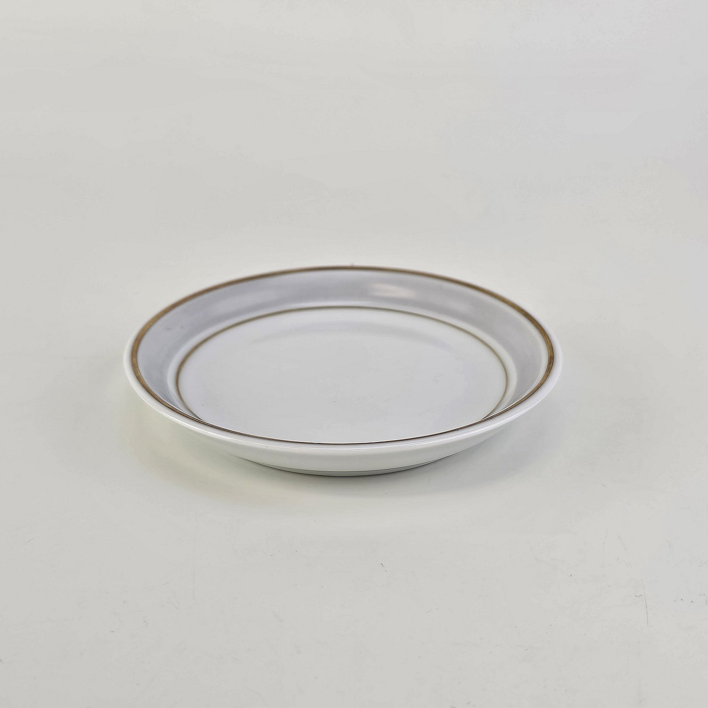 Tiber er stel i glat hvidt porcelæn med grå bort og guldkant