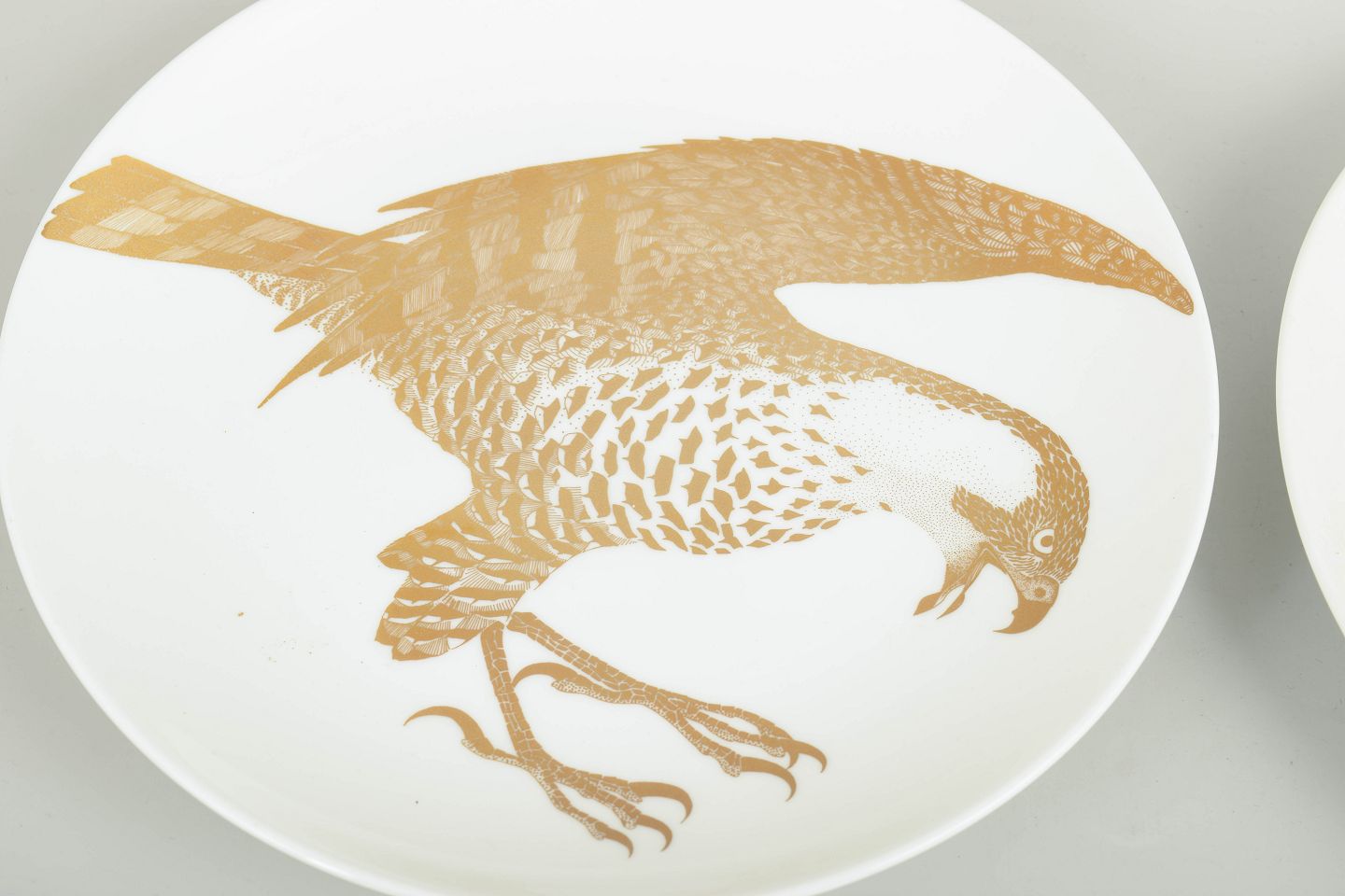 Sæt bestående af tre samlertallerkener i porcelæn med fuglemotiver udført i gulddekoration. Tallerkenerne er en del af serien “Arter i fara”; modelbetegnelserne fremgår af bagsidens tryk med titel, serienummer og artsbeskrivelse. Produceret i begrænset oplag i 1980’erne.