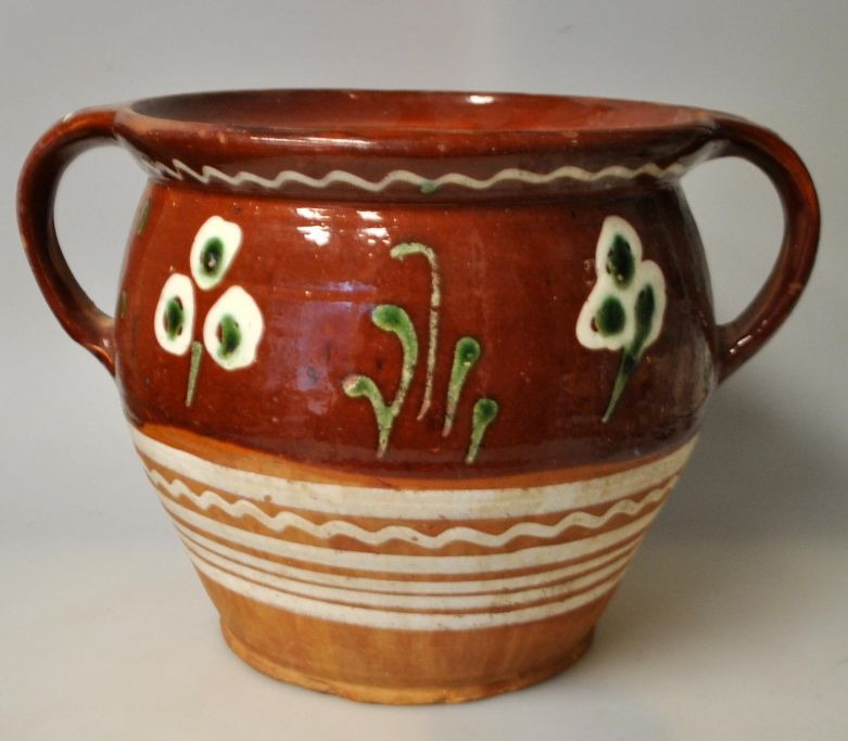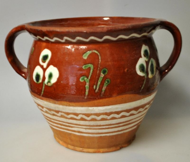 To øret krukke med udvendig brun begitning, Sorring, ca. 1870, Danmark. Dekoreret med blomster og hvide streger. H.: 18 cm. Dia.: 20 cm.