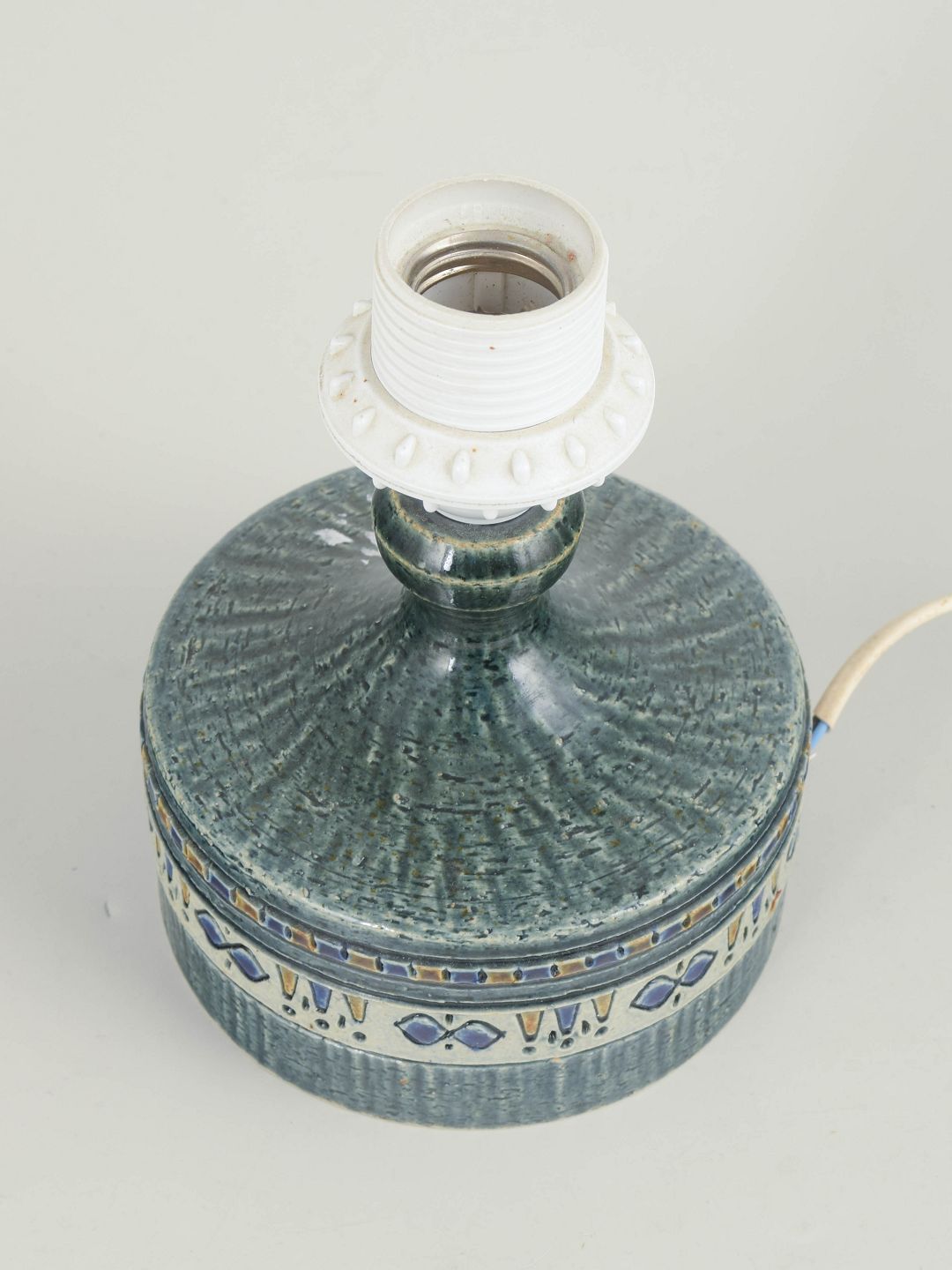 Håndlavet lille bordlampe i glaseret stentøj med balusterformet hals og bred, lav fod. Dekoreret med et bånd af geometriske motiver i blå, gule og brune toner under en grågrøn glasur.