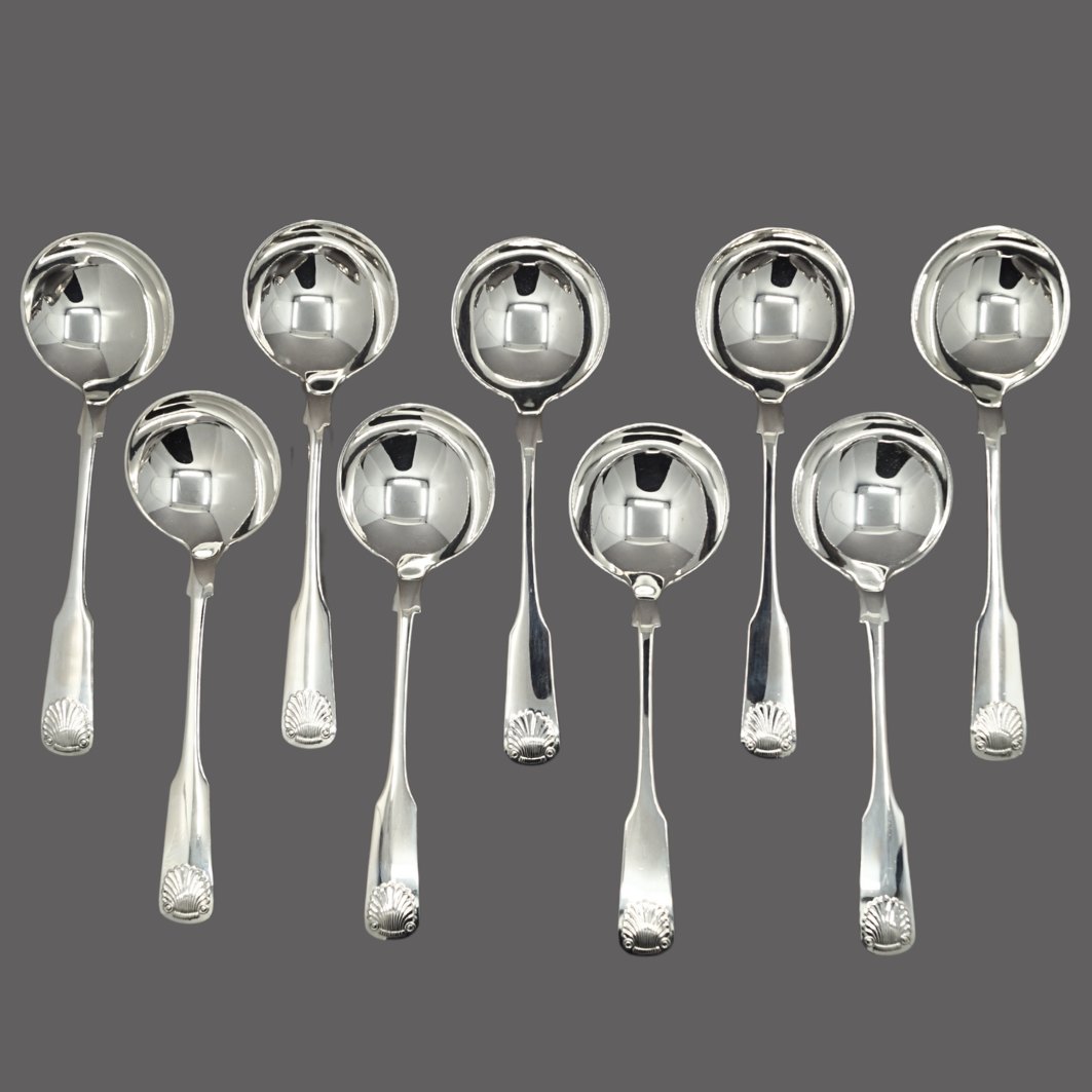 Sæt af 9 Musling bouillonskeer i tretårnet sølv.