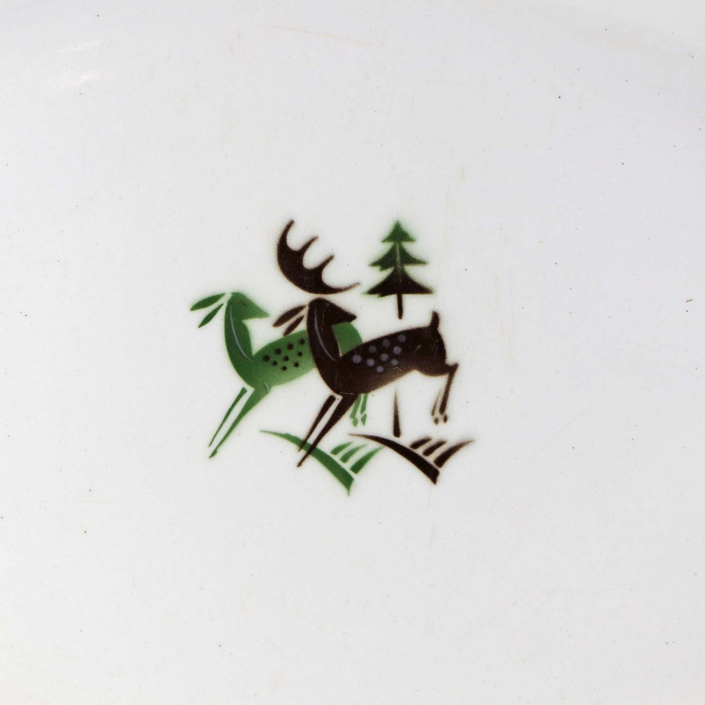 Fajancestel i stelform C med dekoration af grøn og brun hjort på lys baggrund med kantbort af blade i brune nuancer.