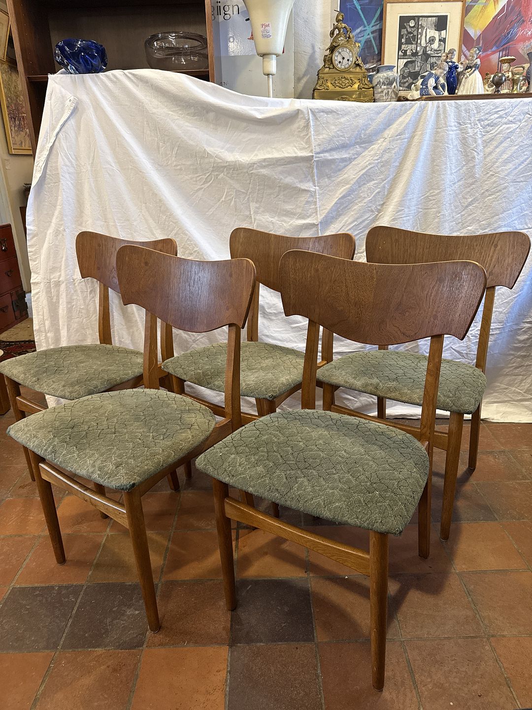 Dansk møbelproducent sæt af 5 spisestuestole i eg m. rygstykke i fineret teak samt sæde betrukket med stof. Fremstillet ca. 1950'erne.