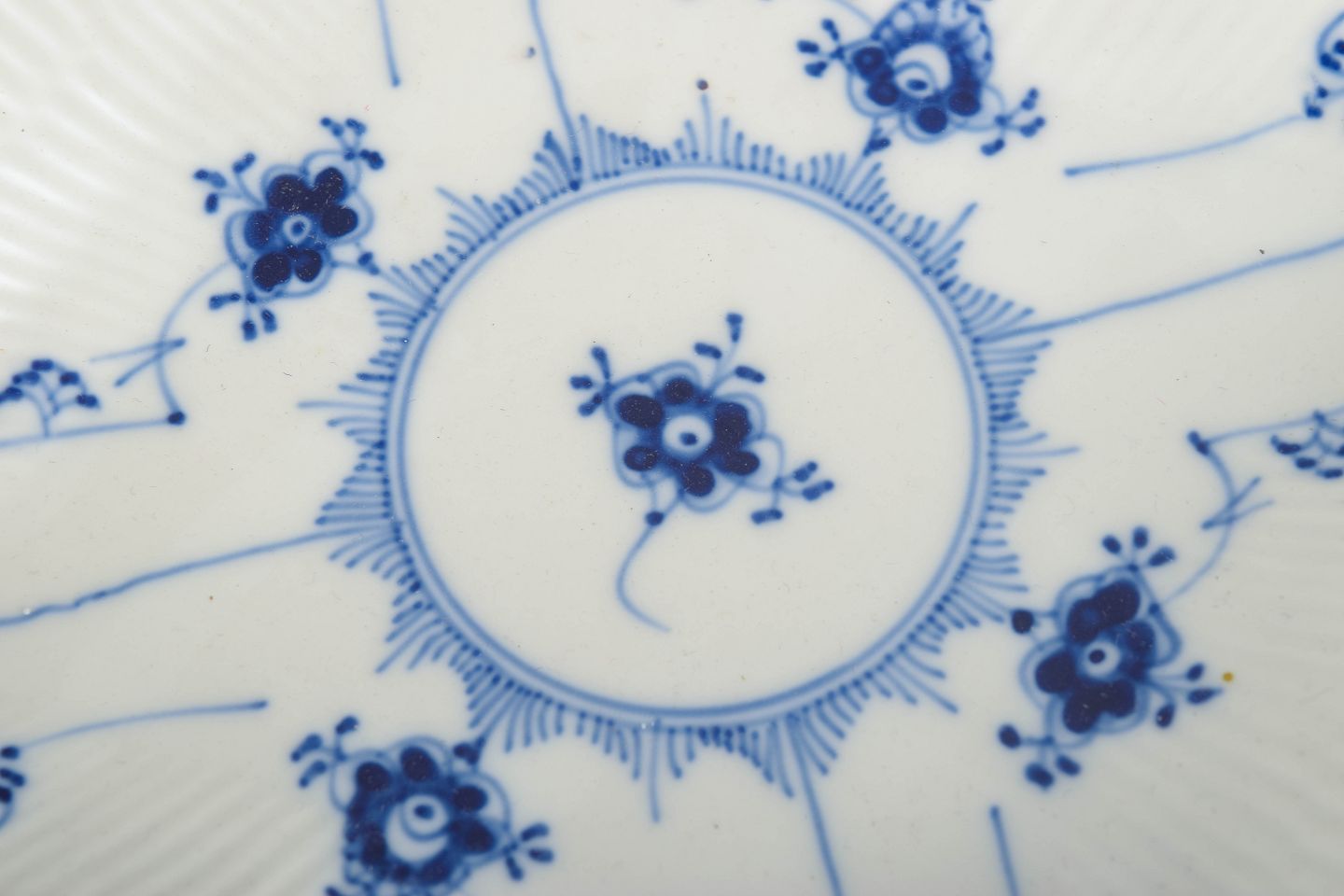 Firkantet fad i håndmalet porcelæn fra Musselmalet Halvblonde med klassisk underglasurdekoration i koboltblå, riflede felter og karakteristisk blondekant. Model 1/708. Første sortering. Måler H. 6 cm, B. 22 cm. Fremstillet 1965.