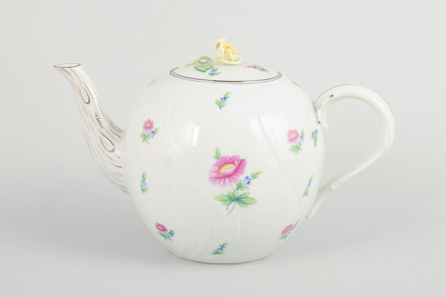 Tekande i håndmalet porcelæn fra Herend. Dekoreret med naturalistiske blomster i rosa og blå nuancer samt fine grønne blade. Låget afsluttes med knop formet som en gul rose. Fabriksmærket i blåt under bunden.