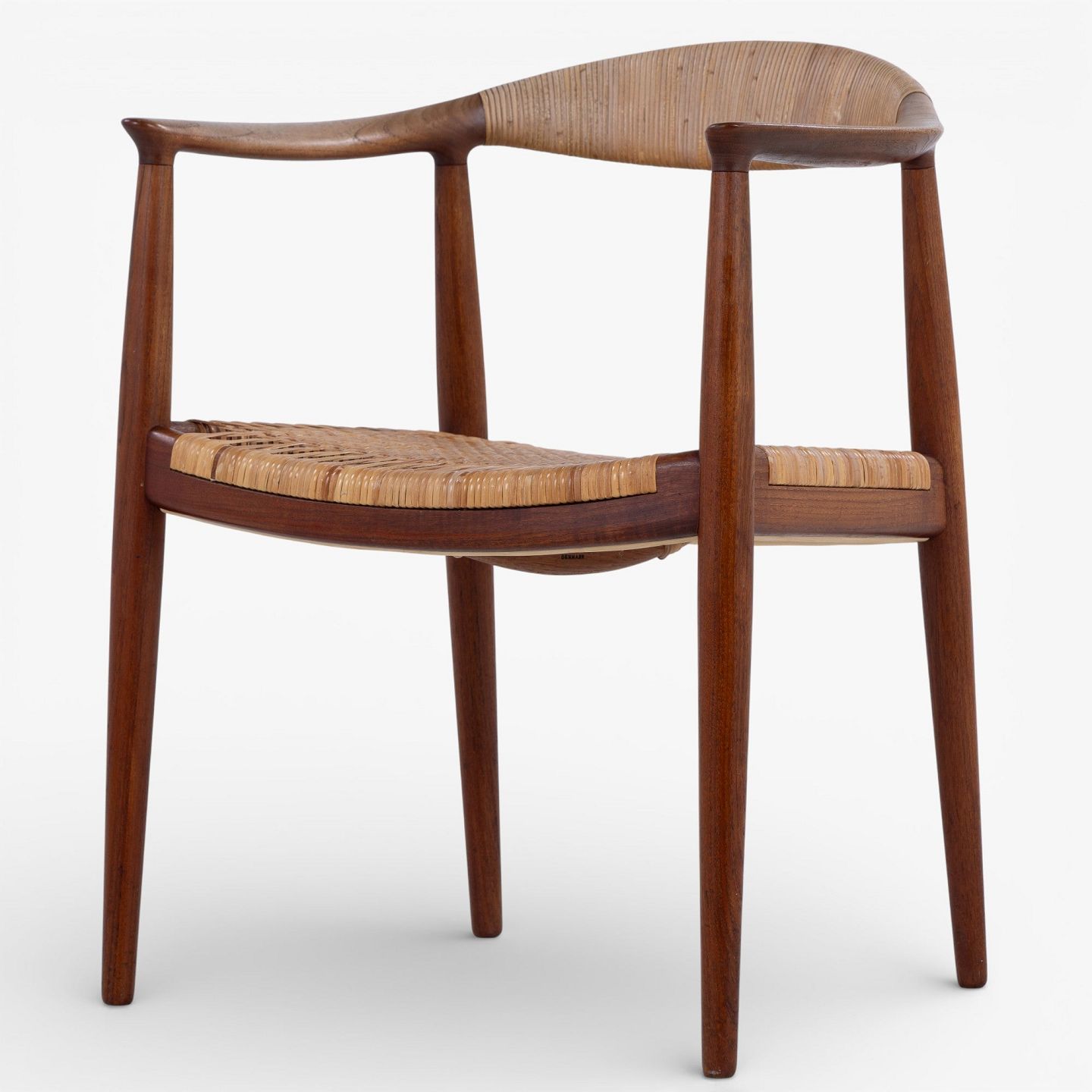 JH 501 - Sæt á 6 'The Chair'-spisestole i patineret teak med sæde og ryg i flet.