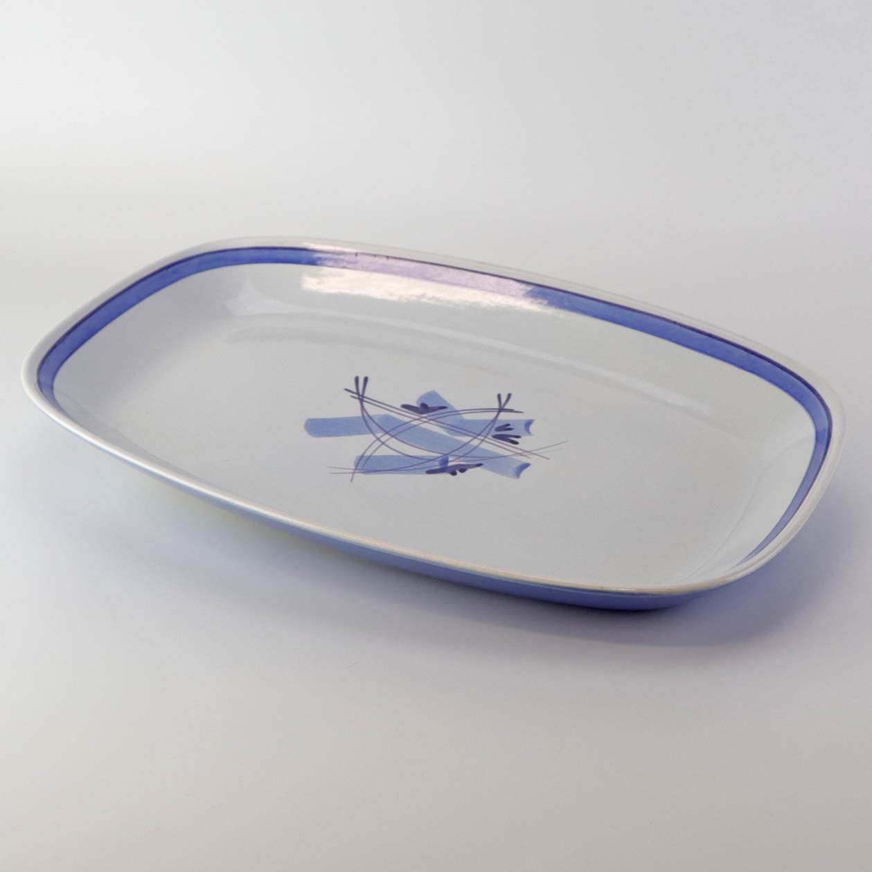 Fajancestel i stelform CA med dekoration af abstrakt motiv i blå og lyseblå på en råhvid baggrund.