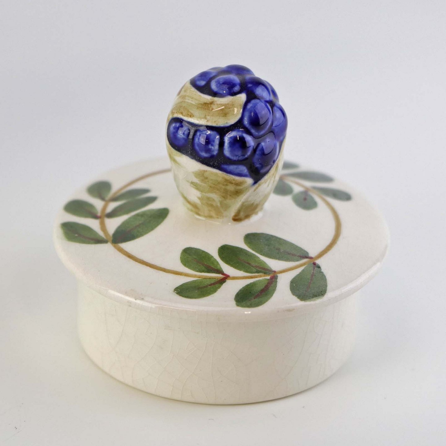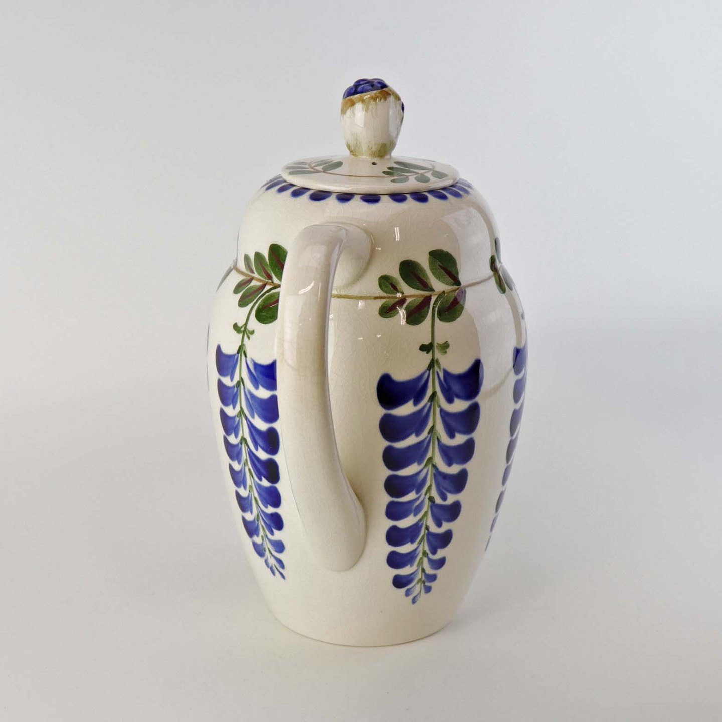 Fajancestel med dekoration af ranker af blåregn og blade på lys baggrund afsluttet med kant af runde blå pletter.