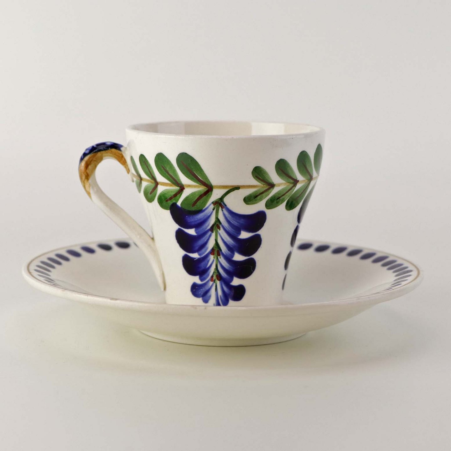 Fajancestel med dekoration af ranker af blåregn og blade på lys baggrund afsluttet med kant af runde blå pletter.