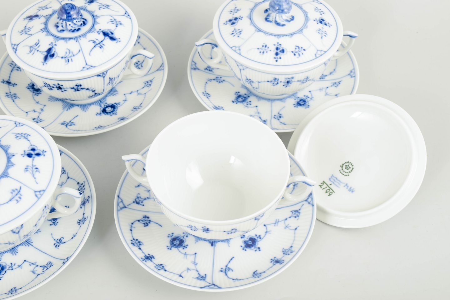 Royal Copenhagen Musselmalet Riflet, sæt på fire bouillon-kopper med tilhørende underkopper.