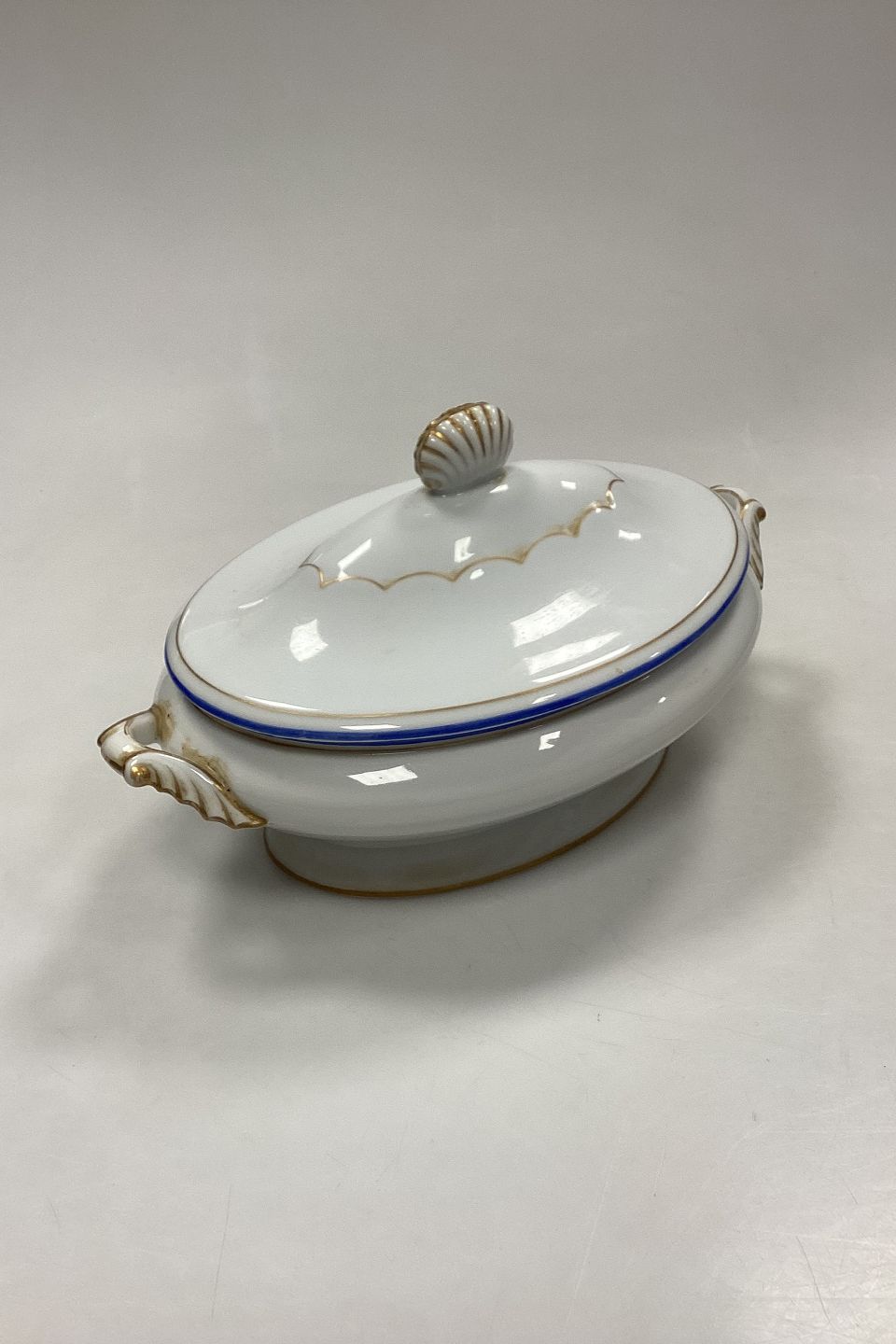 Royal Copenhagen Terrin med Underfad No. 282/9058. Hvidt porcelæn med dekoration i guld og koboltblå. Lettere slid på guld og kanter.
