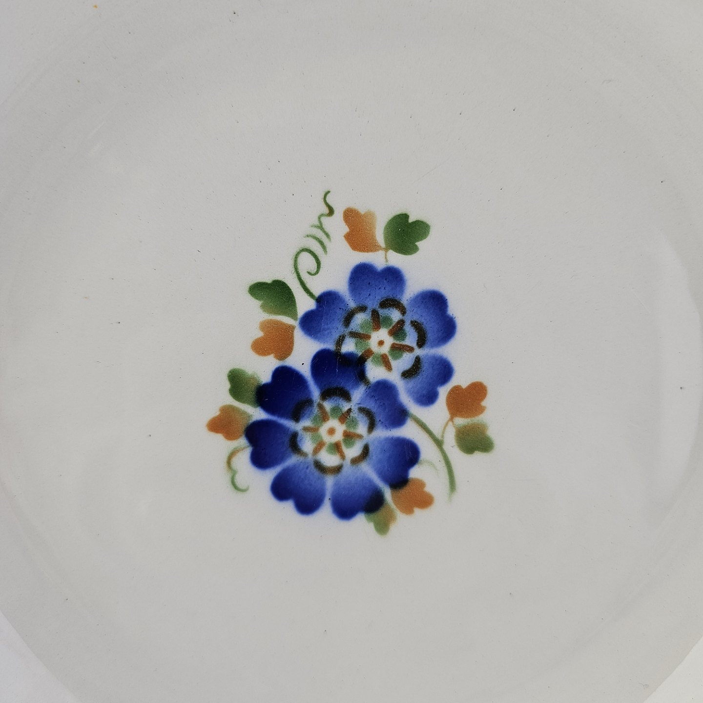 Hvidt fajancestel i stelform Sterling med motiv af blå blomster og blå prikker på kanten.