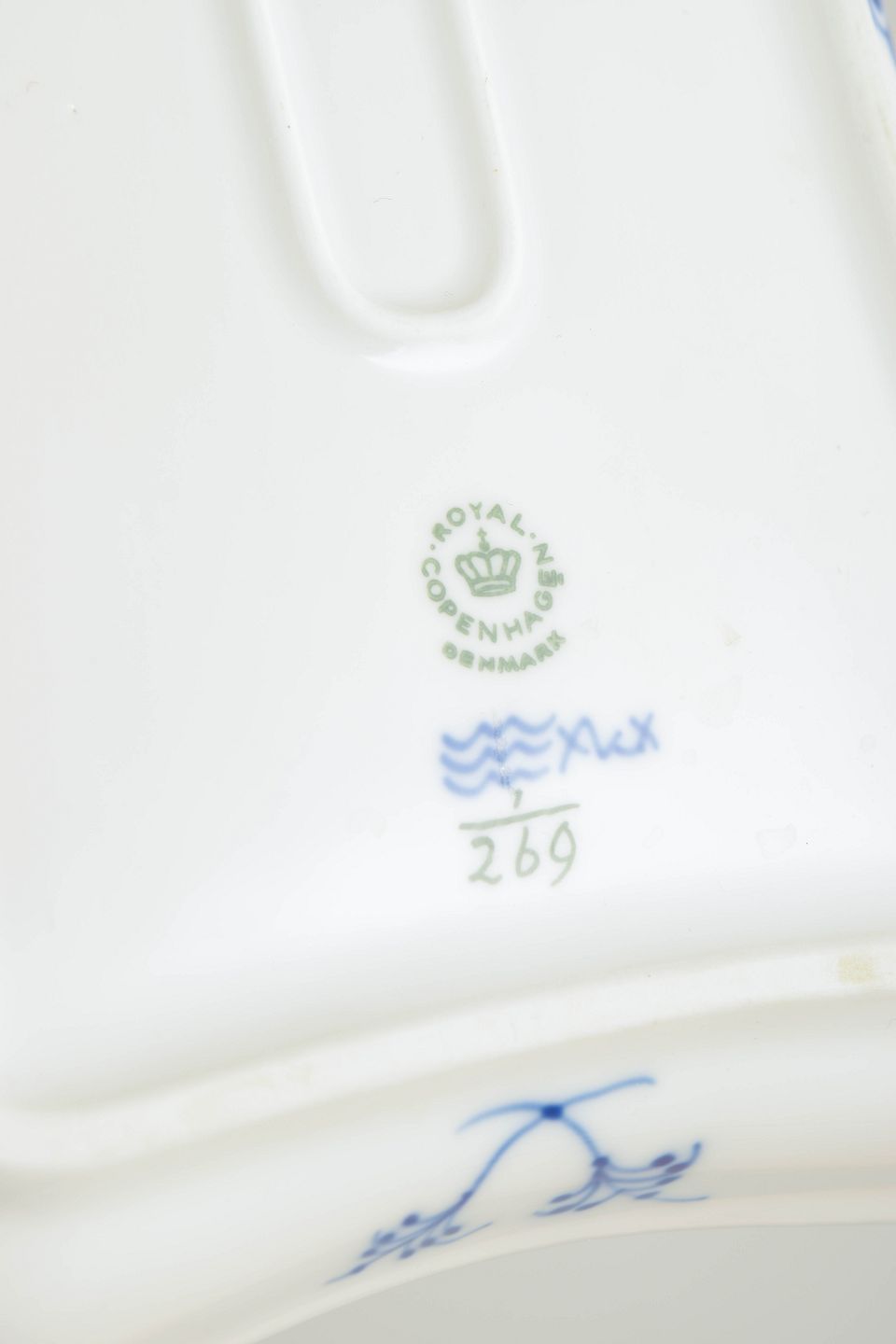 Bakke i håndmalet porcelæn fra Musselmalet Riflet med klassisk underglasurdekoration i koboltblå og riflede felter. Model 1/269. H. 16 cm, D. 24 cm. Annulleret med én indridset streg under bunden. Fremstillet i 1965.