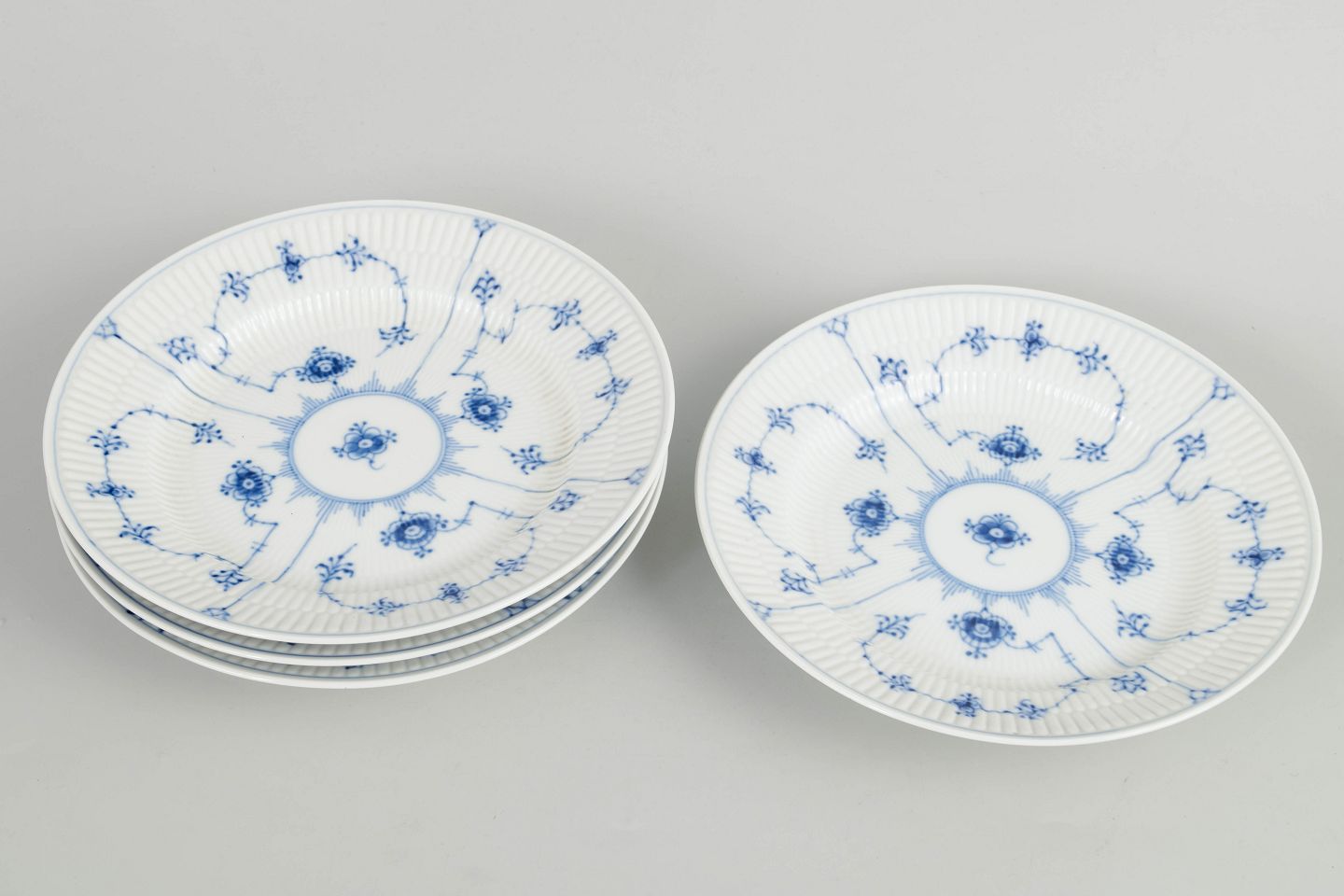 Sæt af fire frokosttallerkener i håndmalet porcelæn fra Musselmalet Riflet med klassisk underglasurdekoration i koboltblå og riflede felter. Model 1/178. Diameter 21 cm. Første sortering. Fremstillet i 1980’erne.