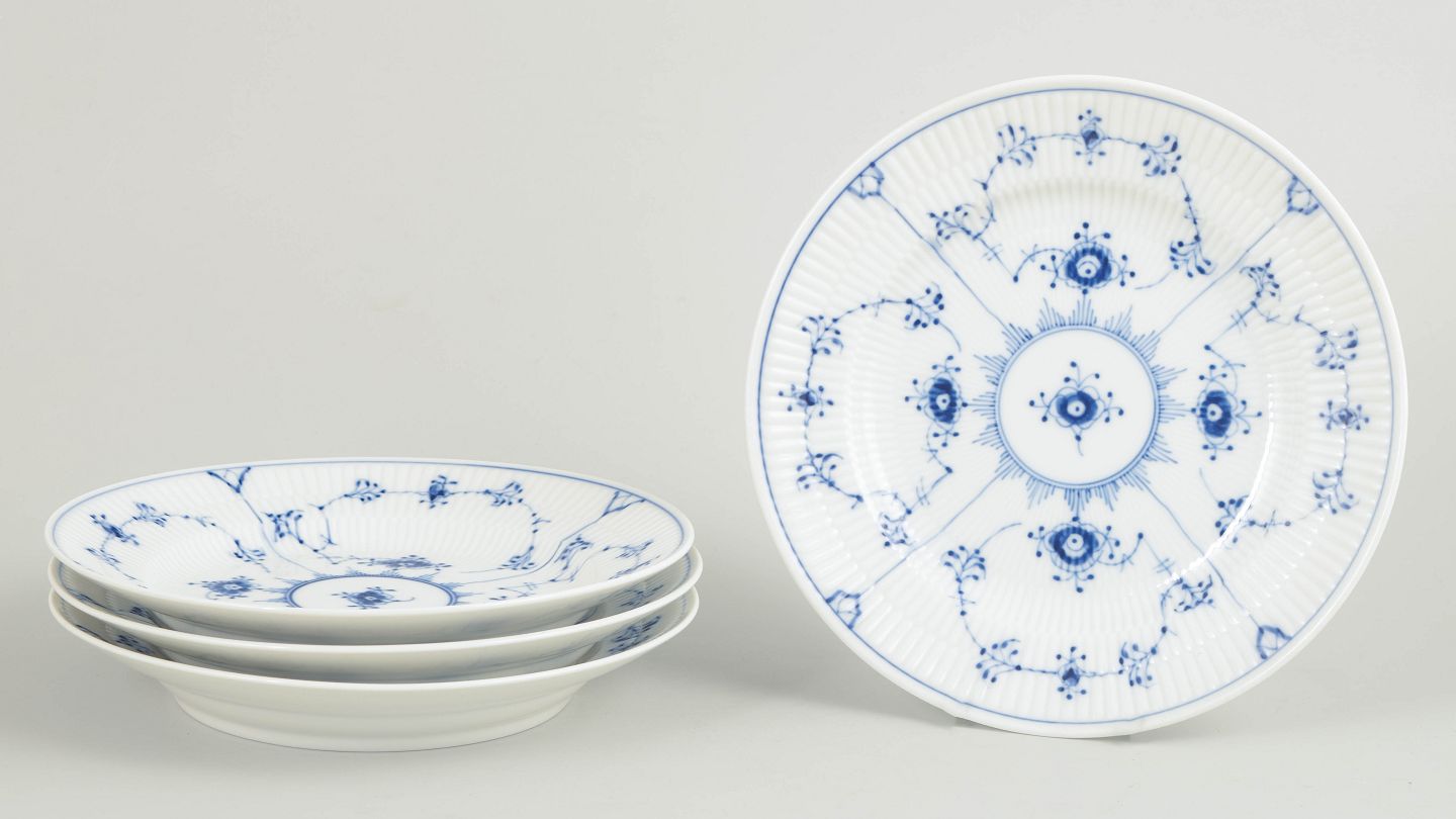 Royal Copenhagen Musselmalet Riflet sæt af fire frokosttallerkener.